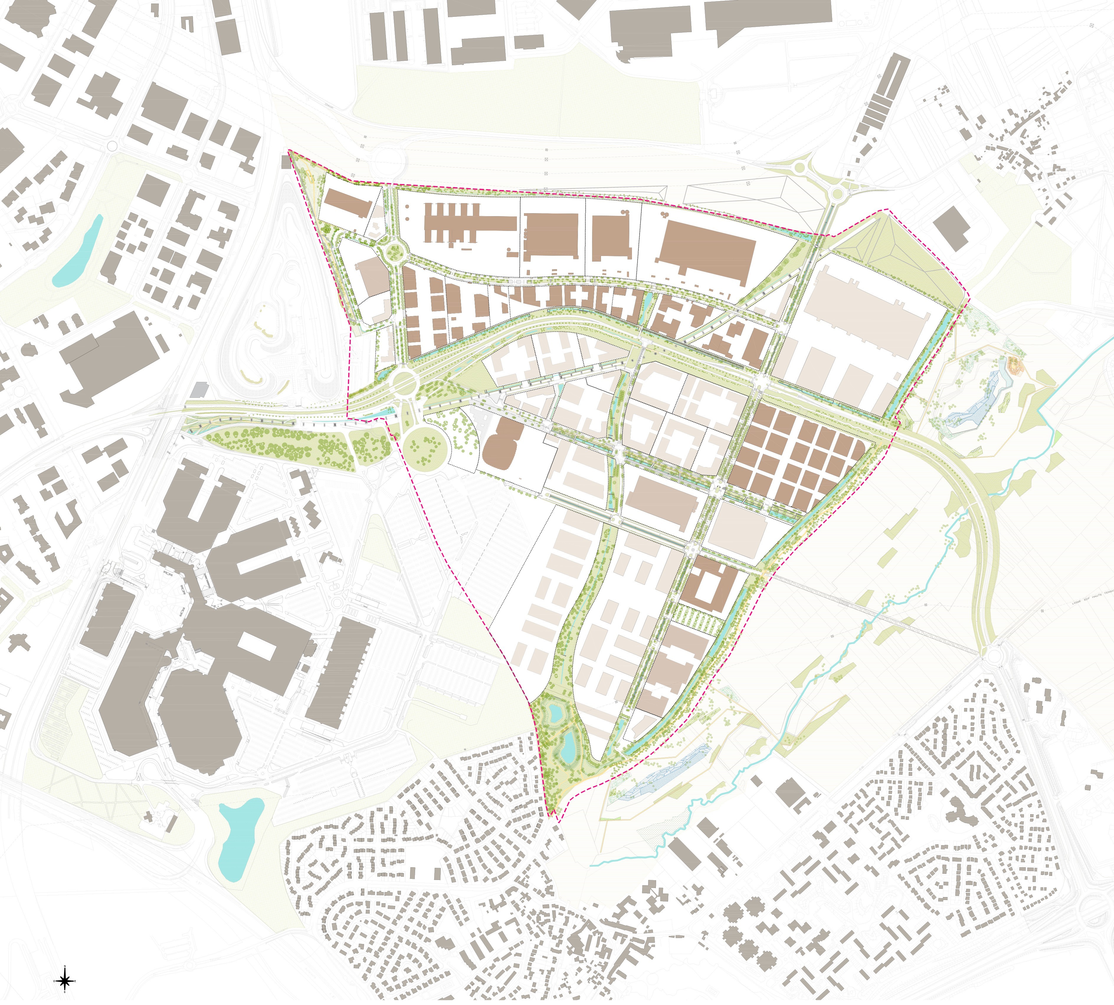 Le projet s’appuie sur la topographie naturelle du site et sur les tracés historiques qui structurent le territoire : anciens chemins ruraux, lignes de crête et talwegs. Les grandes infrastructures du projet s’inscrivent dans cette lecture du site : le viaduc de la ligne 17 du métro reprend l’emprise de l’ancien chemin de Saint-Denis, la rue du Sausset est implantée sur la ligne de crête, et le parc de la Pointe Sud récupère les eaux des noues implantées le long des voiries.