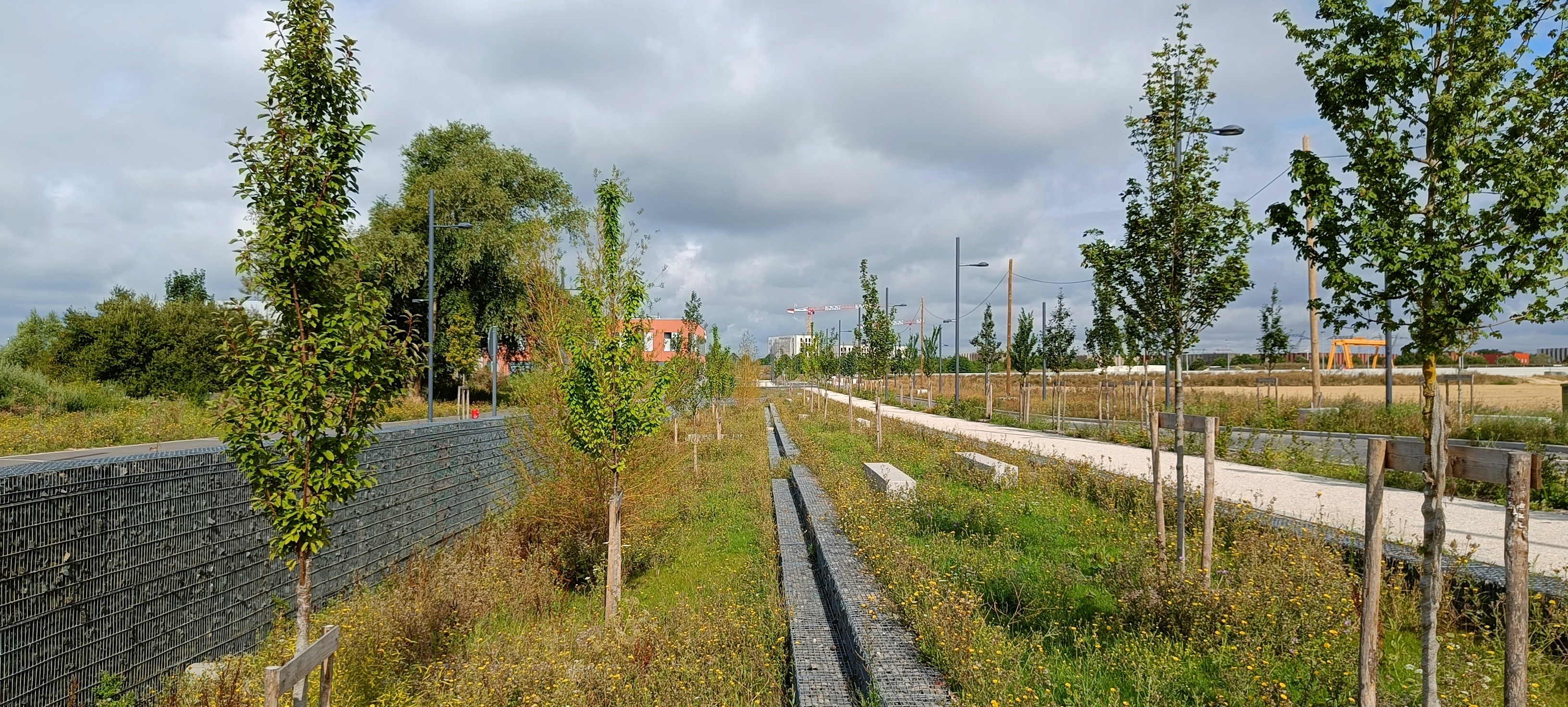 AeroliansParis développe des aménagements en harmonie avec la géographie du site : une trame orthogonale épouse les mouvements du terrain naturel et reprend les anciens chemins agricoles, structurant l’organisation des espaces publics du quartier.