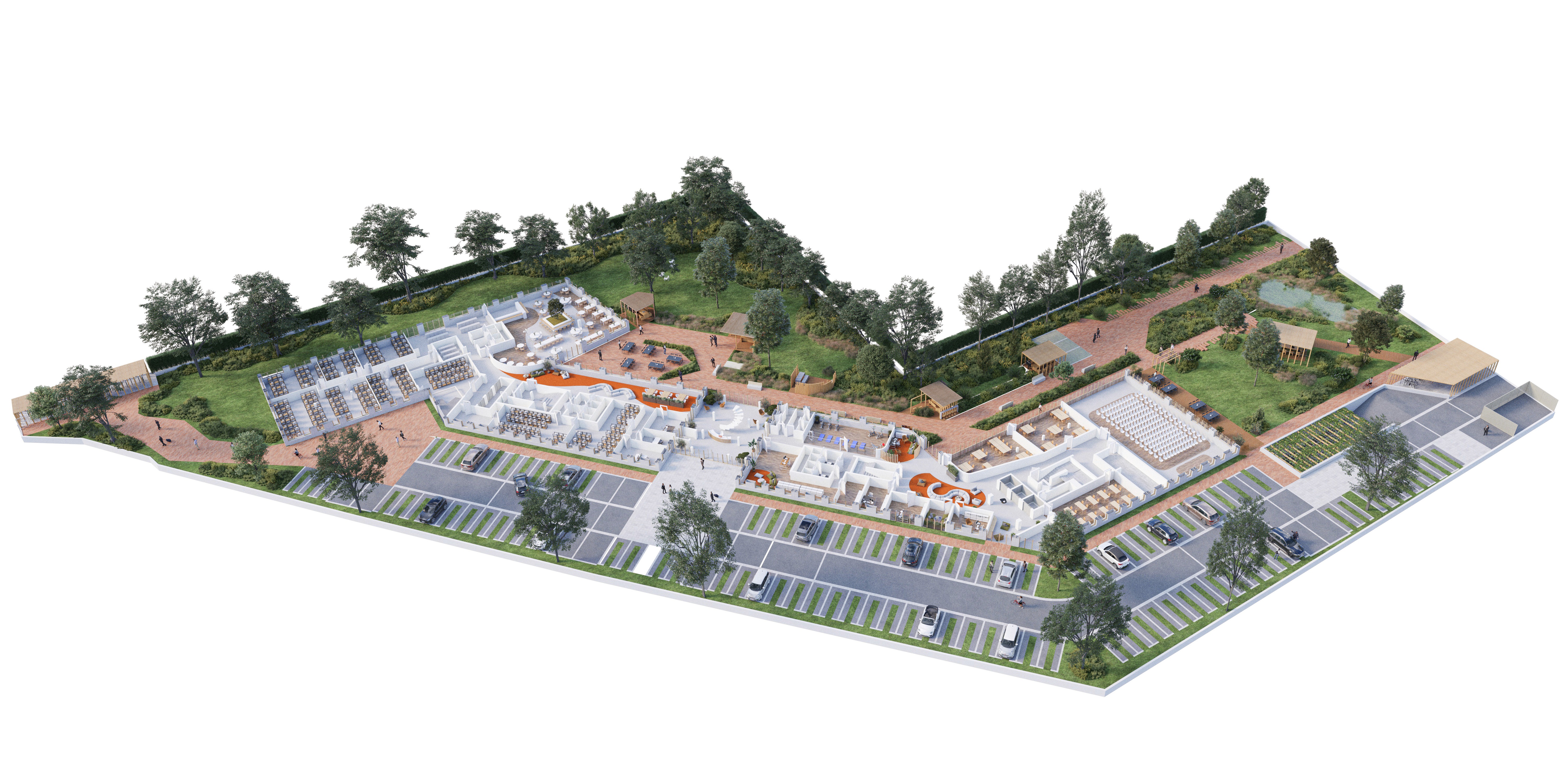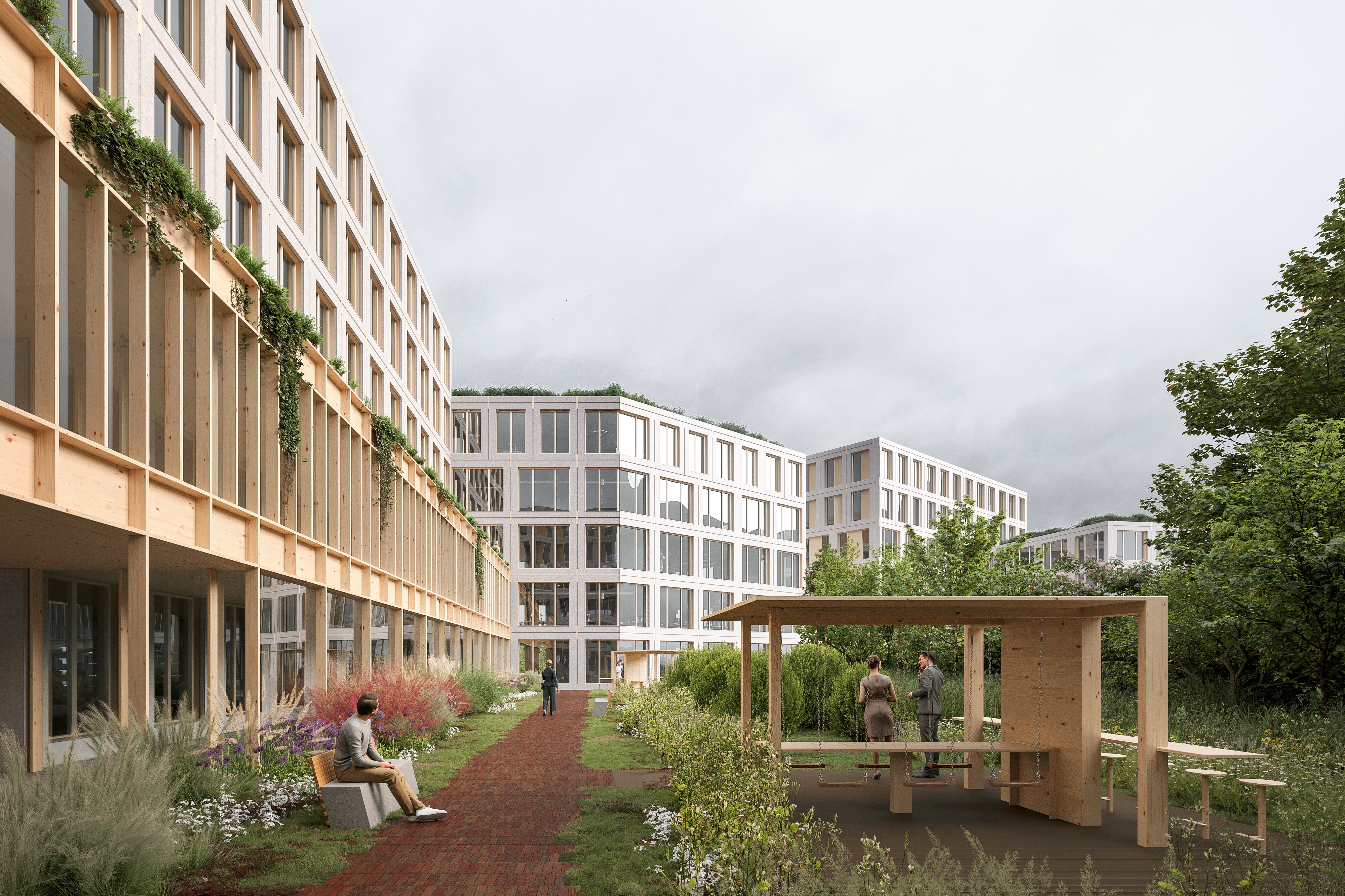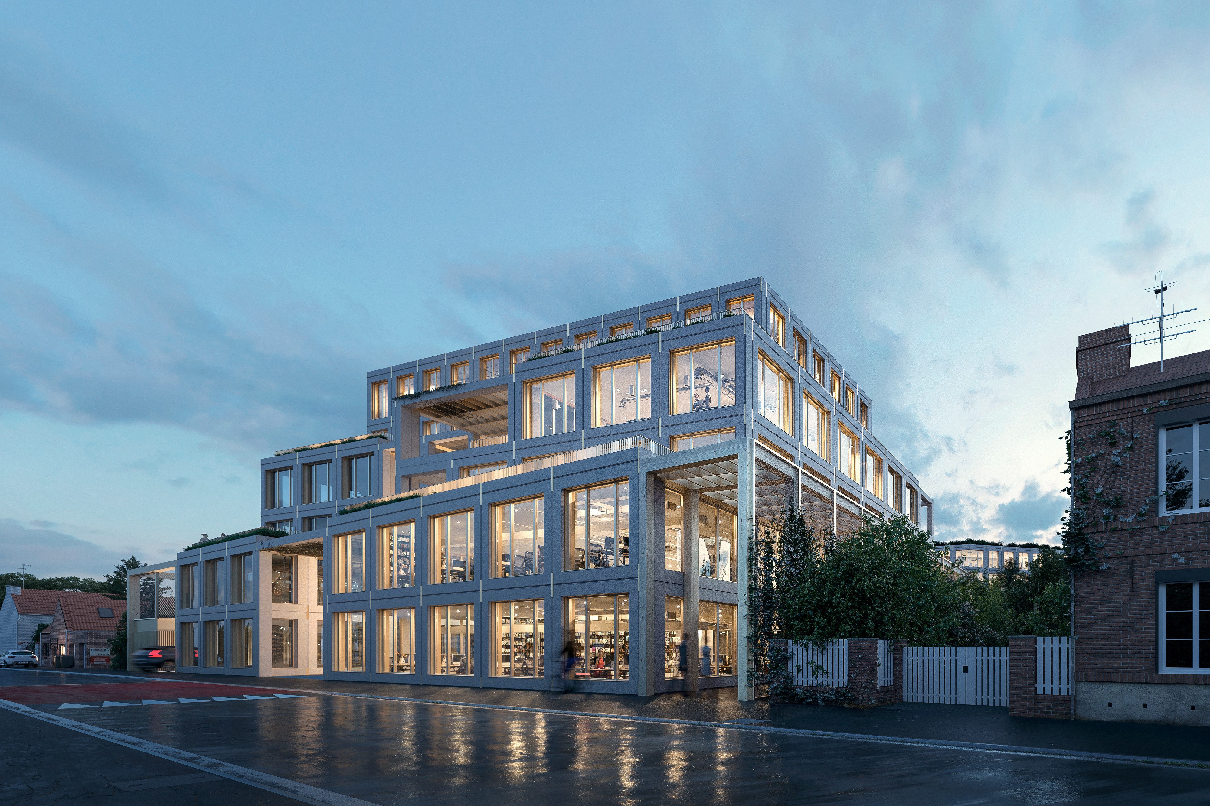 Le projet veille à ménager l’échelle avec le voisinage résidentiel, en évitant l’effet de masse par des percées de lumière et des variations de volumes. Il articule des programmes tertiaires flexibles dans une écriture unitaire : chaque bâtiment reste indépendant mais s’inscrit dans une cohérence d’ensemble grâce au parc, qui fédère et anime l’opération.