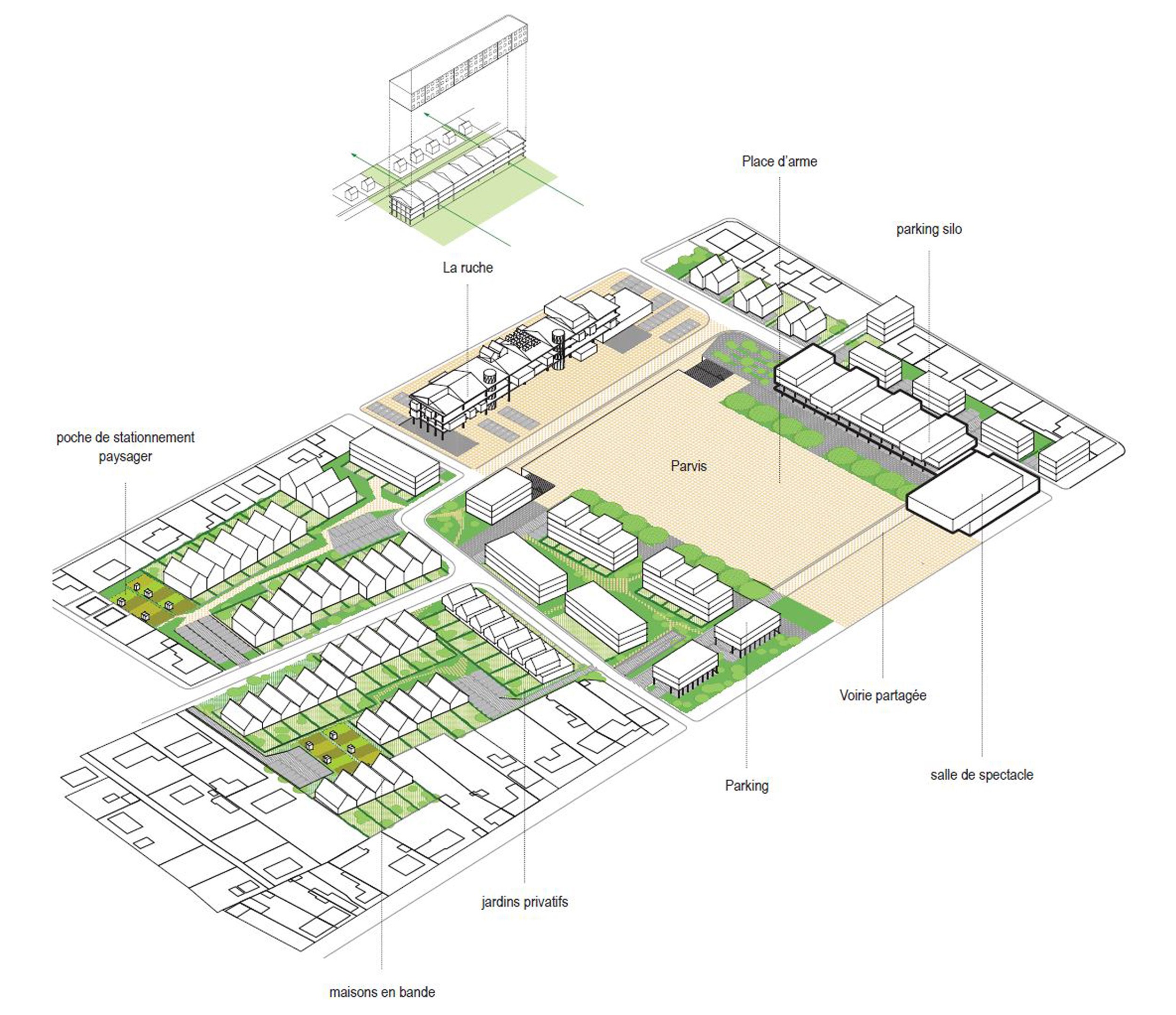 Apporter une mixité fonctionnelle au sein de cet espace (activités, logements, espaces publics…) ;