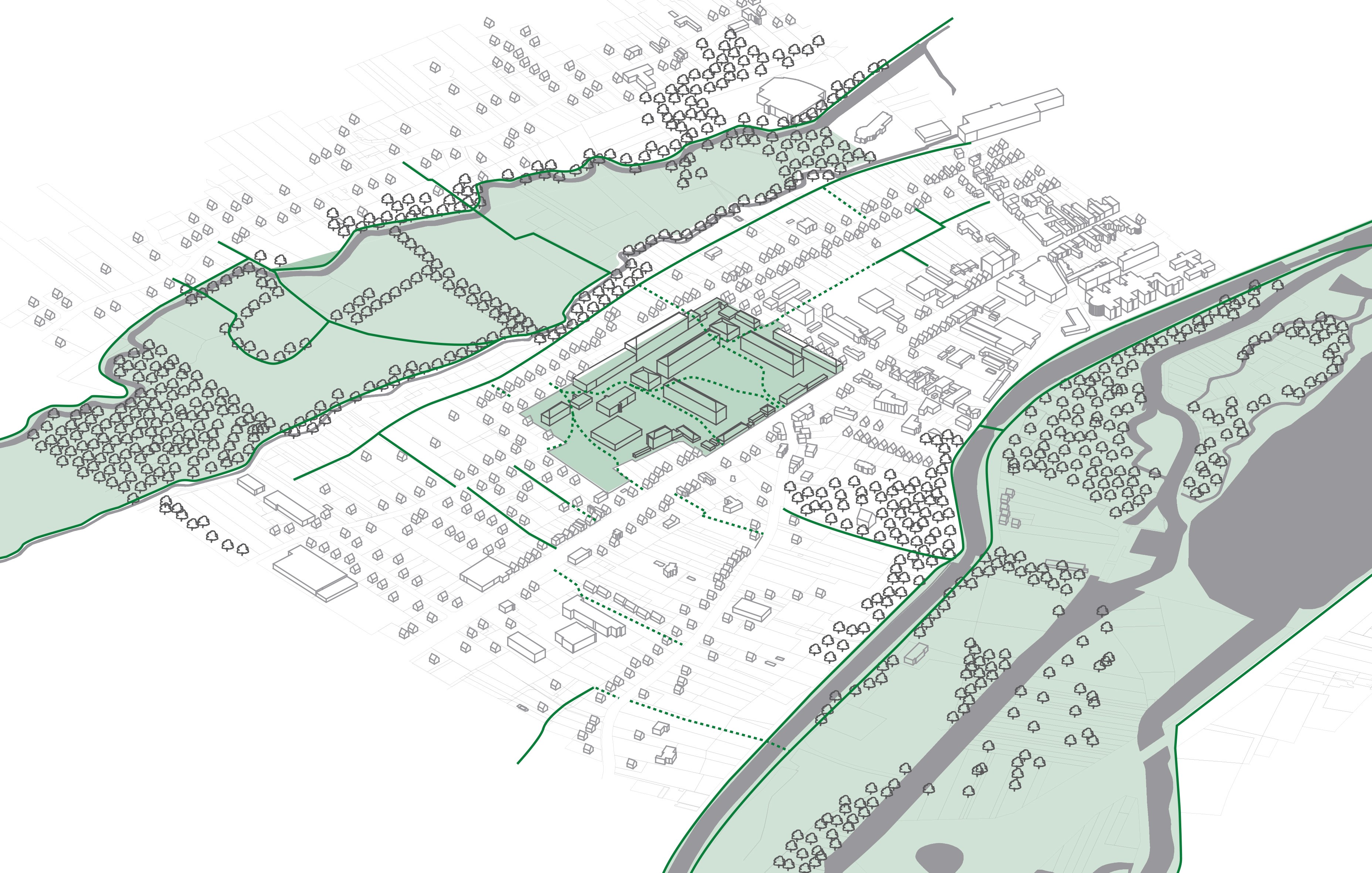 Inscrire le projet dans son environnement proche, autant à travers les espaces naturels du canal du Briare et du parc départemental, que de la zone pavillonnaire enclavée située à l’ouest de l’ancienne caserne, ainsi que le centre historique de Montargis et les zones d’activités attenantes d’Amilly et Villemandeur.