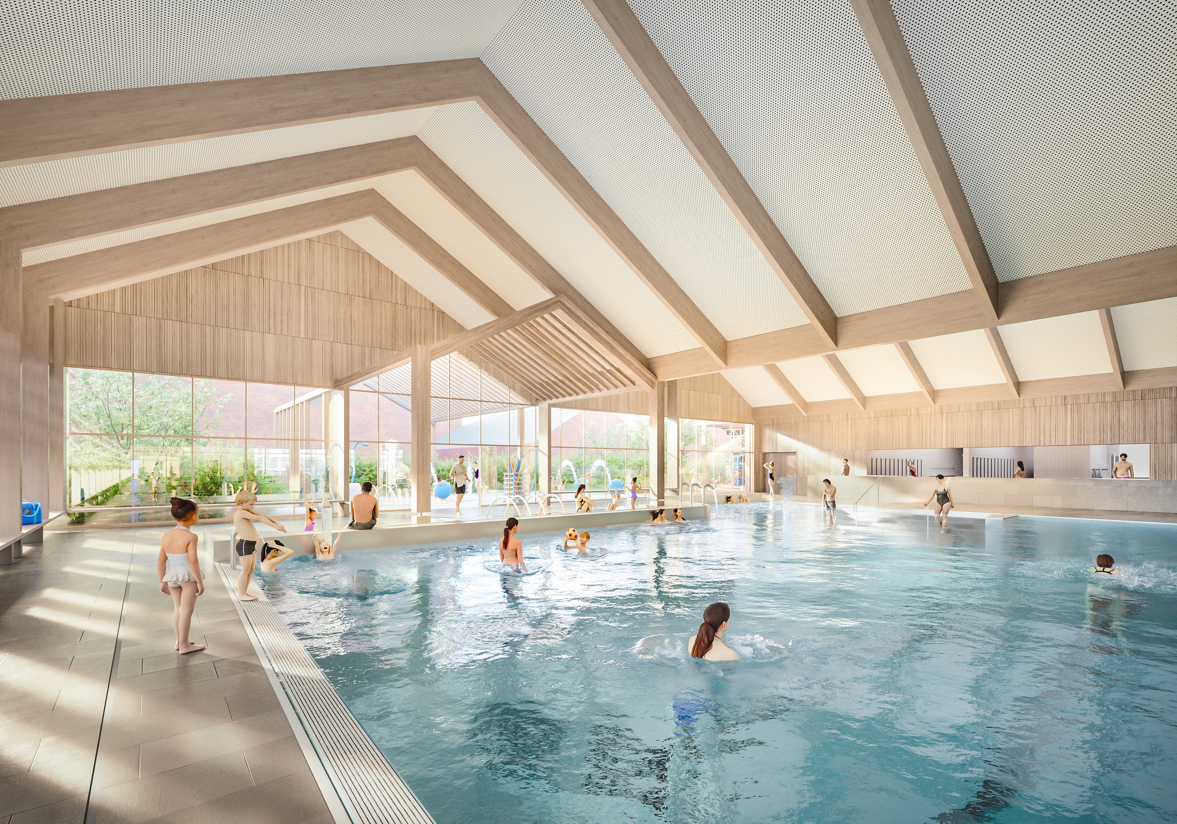 La piscine devient ainsi une pièce architecturale forte, inscrite dans la mémoire du site et ouverte sur son avenir.