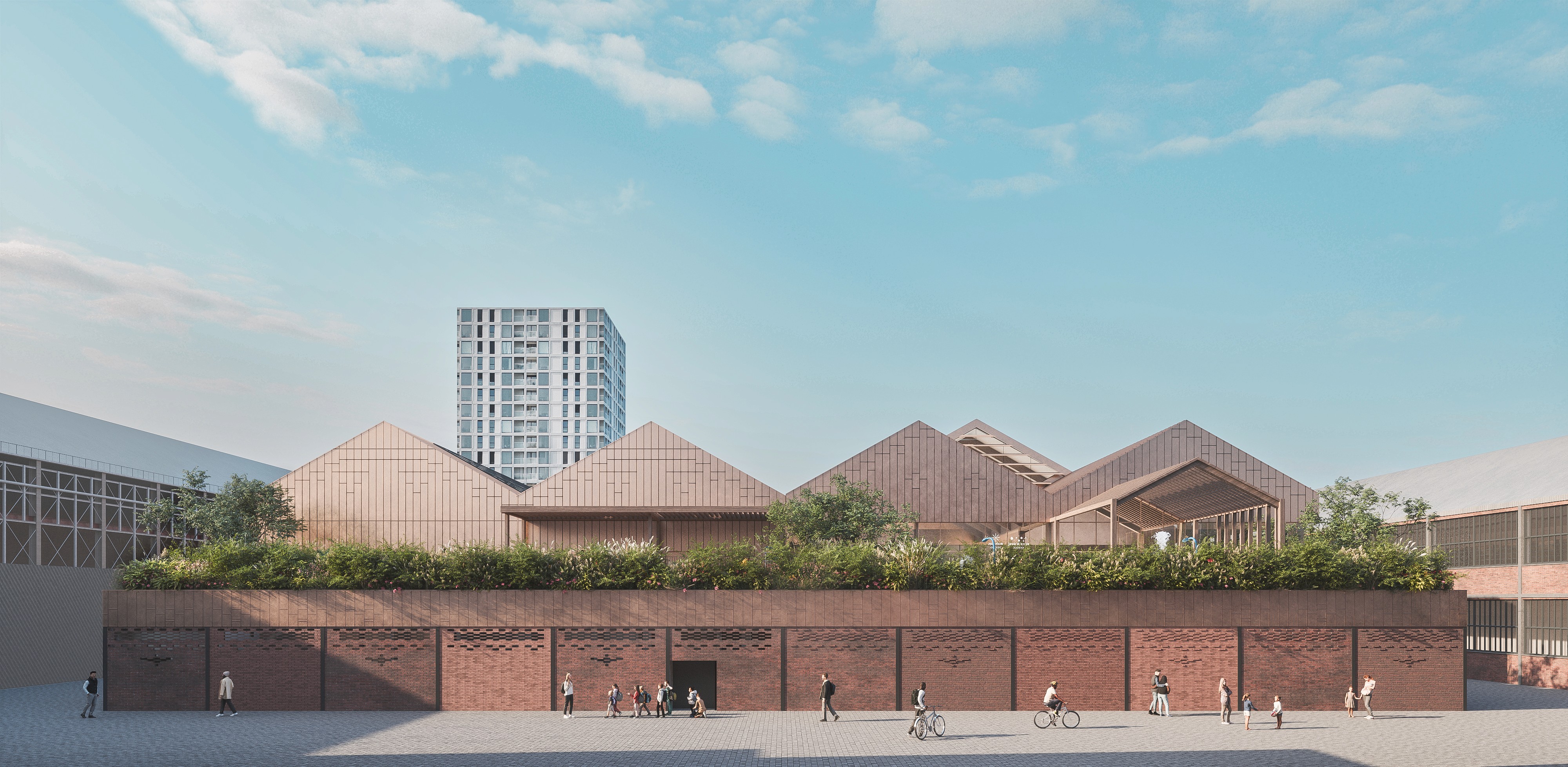 Le socle en brique, nourri du réemploi issu des déconstructions voisines, dialogue avec l’histoire du lieu, tandis qu’une enveloppe métallique ton cuivre en prolonge l’unité. Acier recyclé, briques de l’ancienne usine, luminaires réutilisés et cheminée transformée en support végétal traduisent une démarche frugale et circulaire.