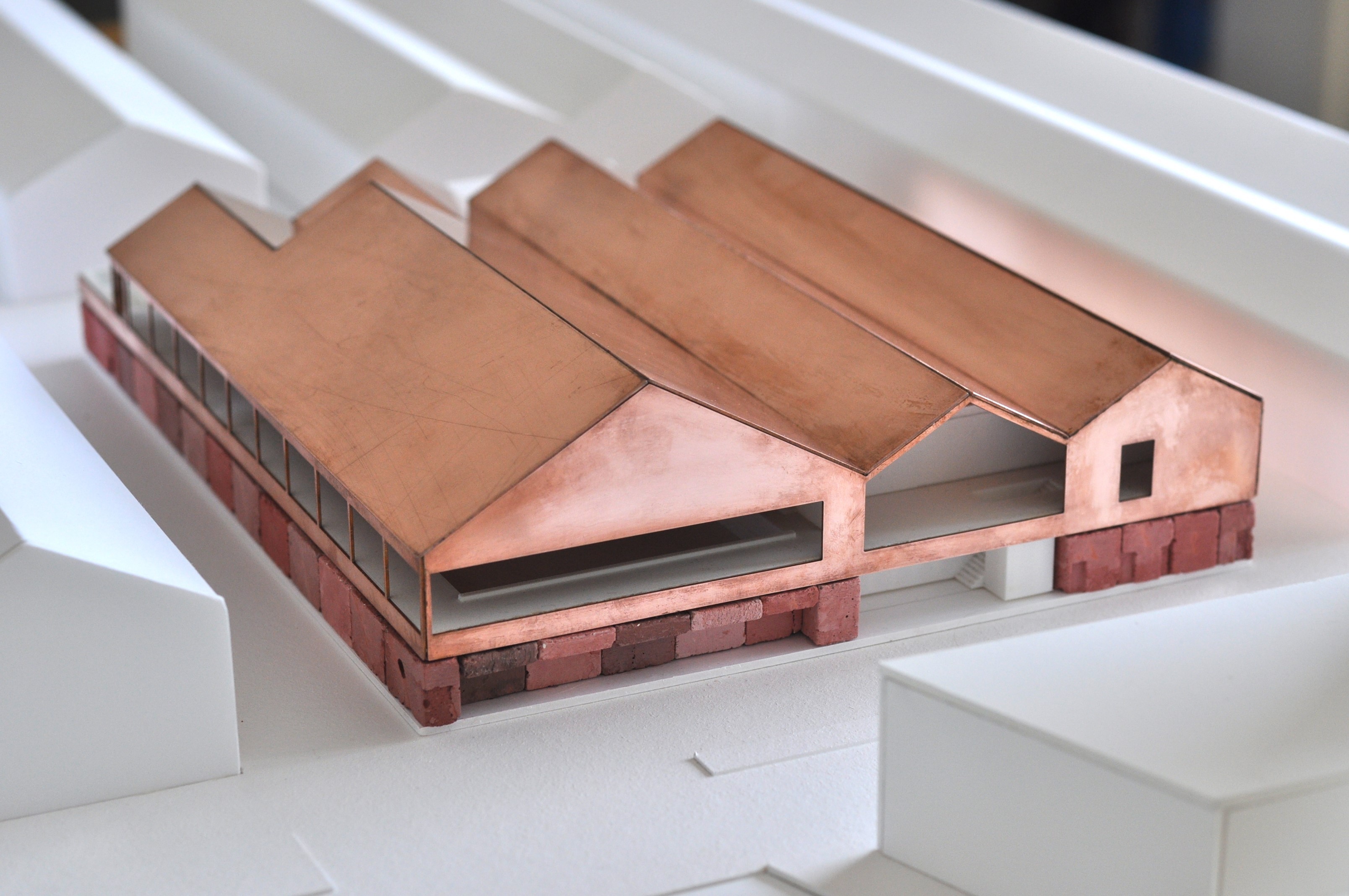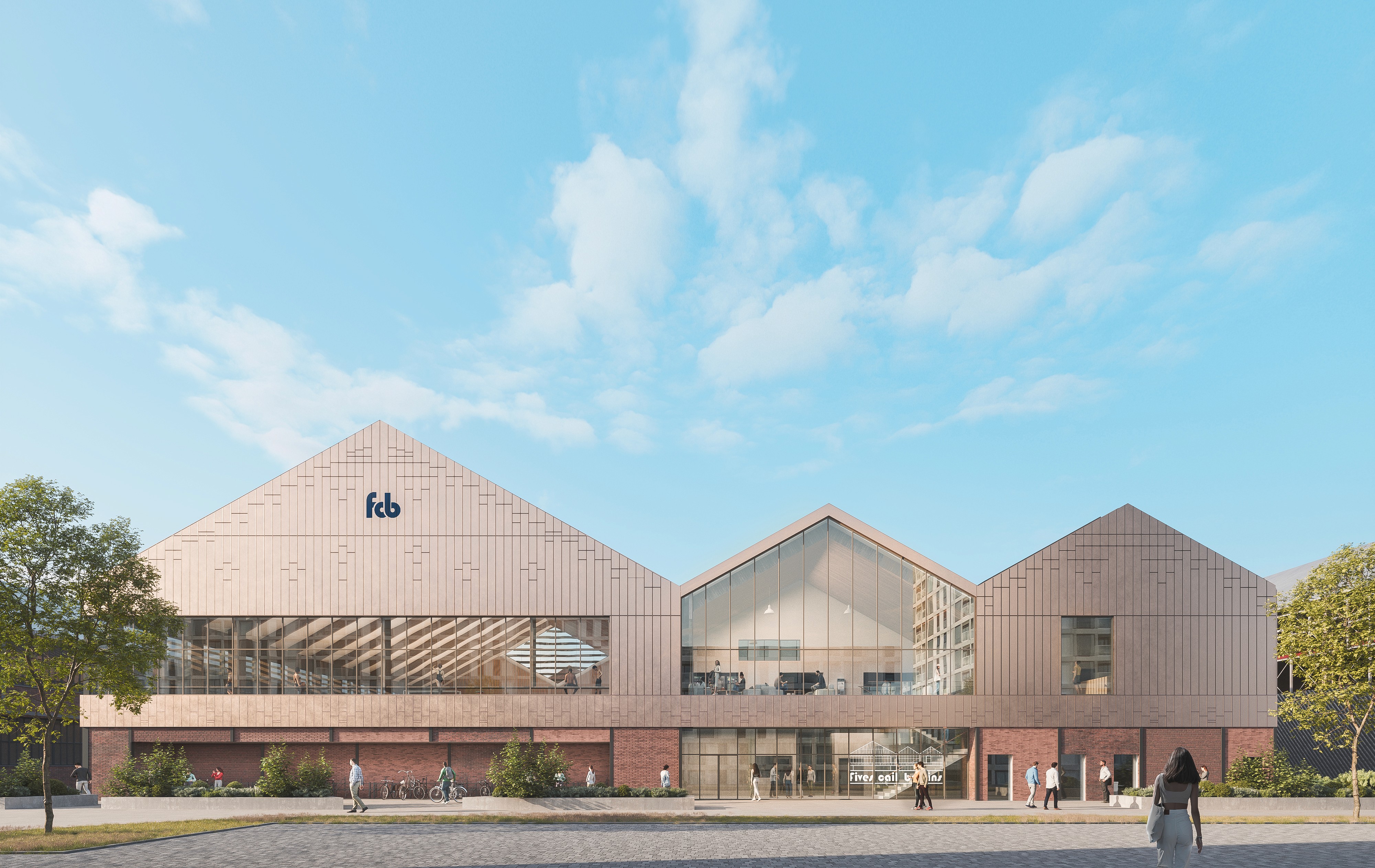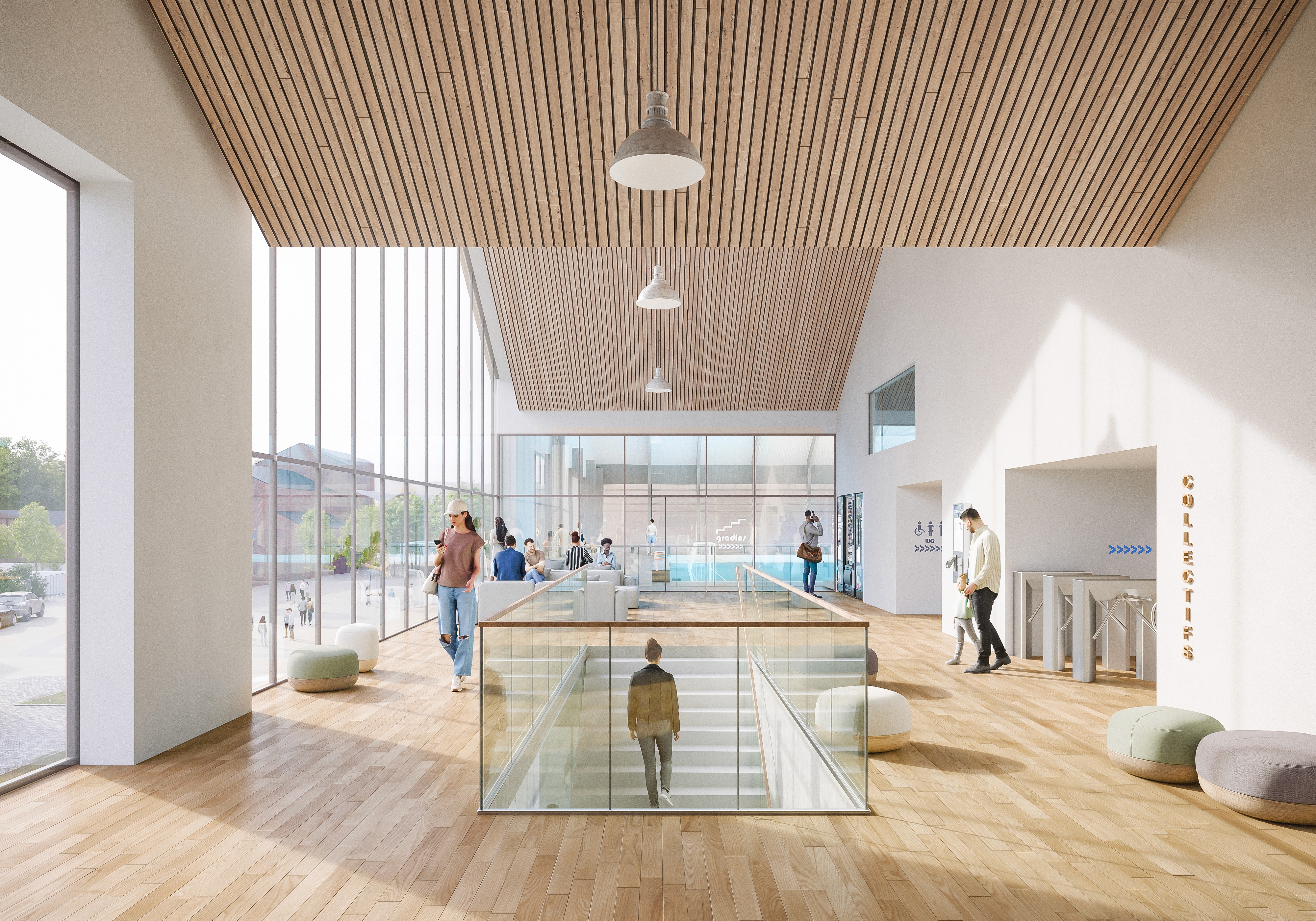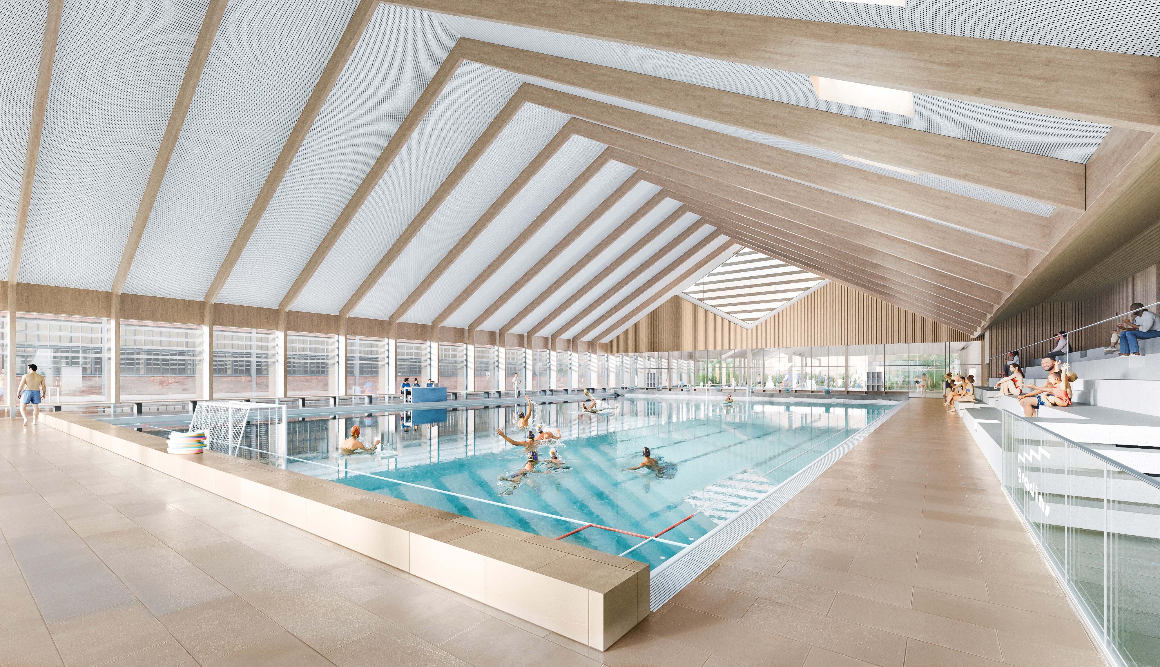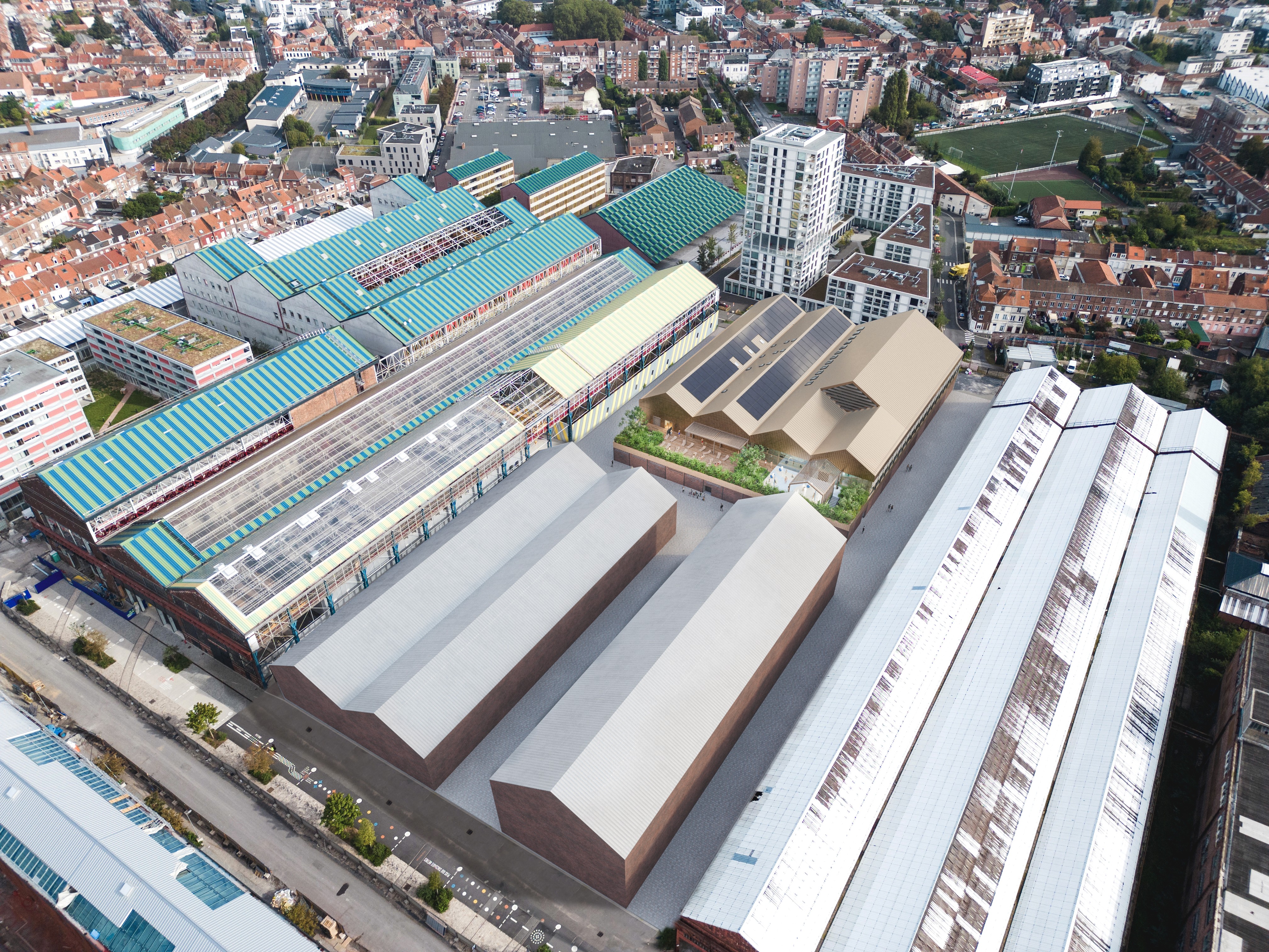 Au cœur de la friche Fives Cail Babcock, le futur centre aquatique se veut témoin de la mutation du site : équipement fonctionnel, accueillant et résolument engagé dans le réemploi. Le projet s’inscrit dans la trame industrielle par un quadrilatère simple aux toitures à double pente, héritage des nefs à sheds. Les volumes se décomposent selon les usages : nefs étroites pour les fonctions servantes, halle principale pour le bassin.