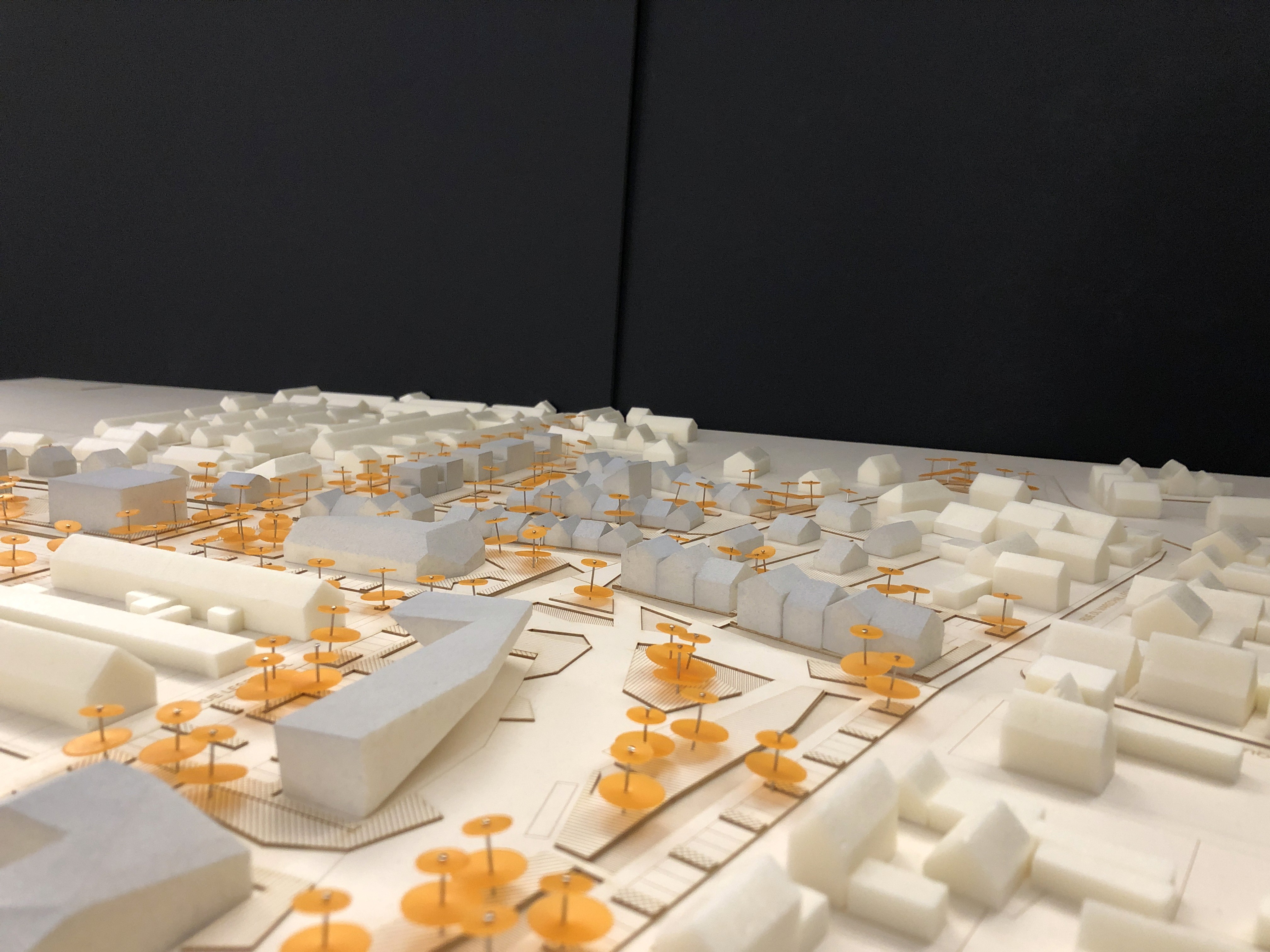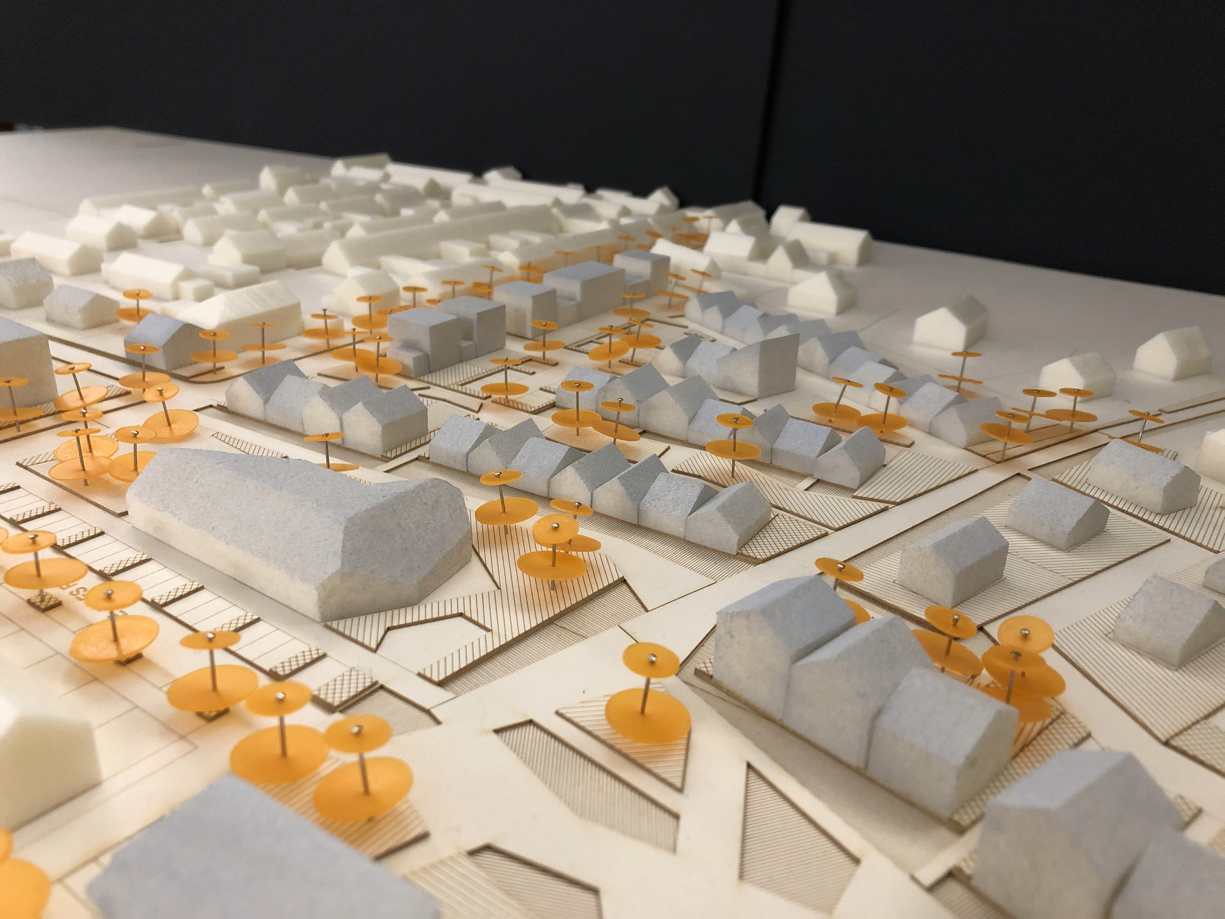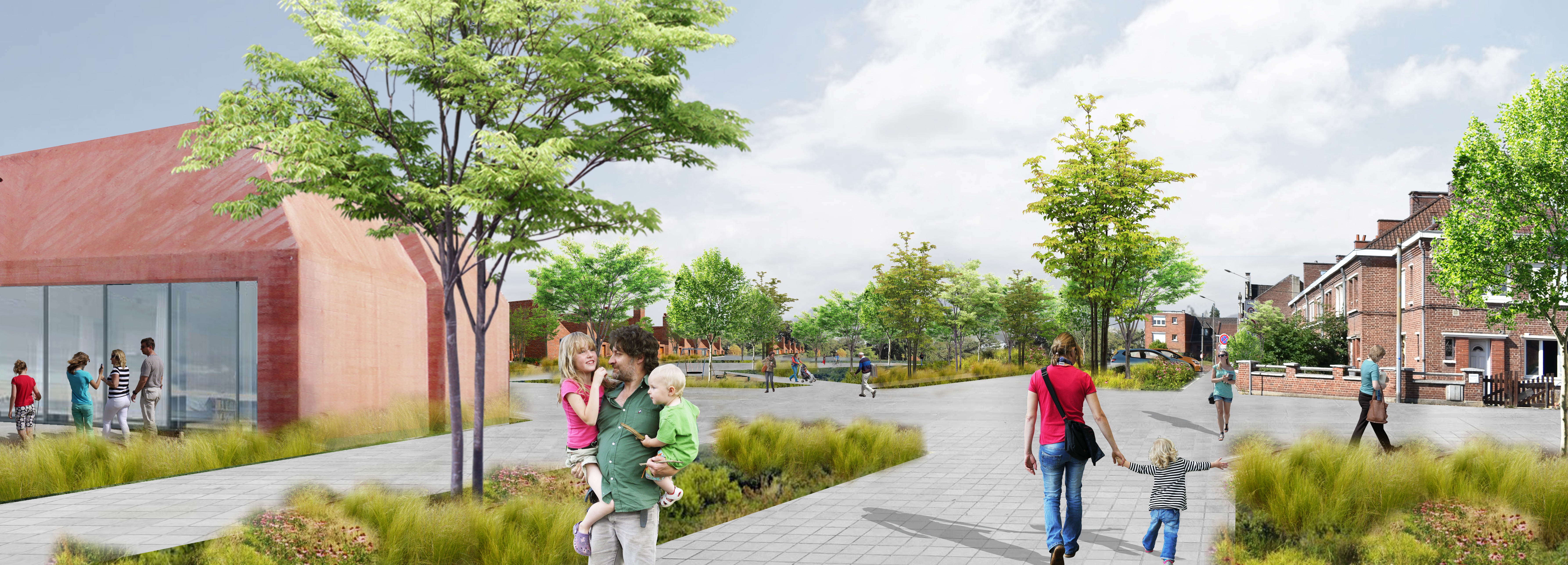 Le projet recompose ce lien par un grand parc central, axe paysager structurant qui relie les deux parties du bourg et fait pénétrer la campagne jusqu’au cœur de la ville. Ce vaste espace public irrigue l’opération, revitalise les connexions entre éléments emblématiques et crée des axes Nord-Sud, jusqu’au parc des Ansereuilles, et Est-Ouest, vers les pâtures et parcelles agricoles.