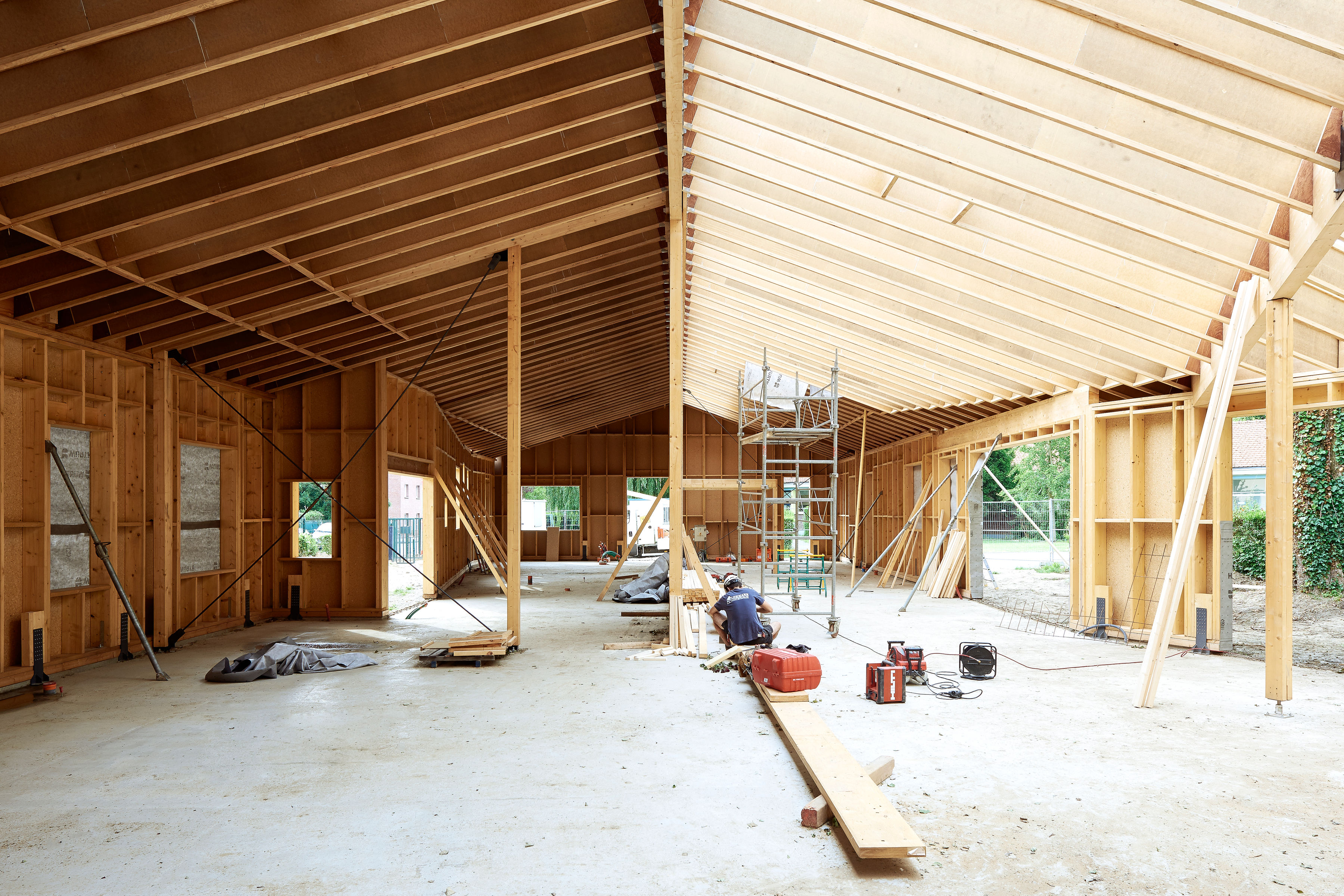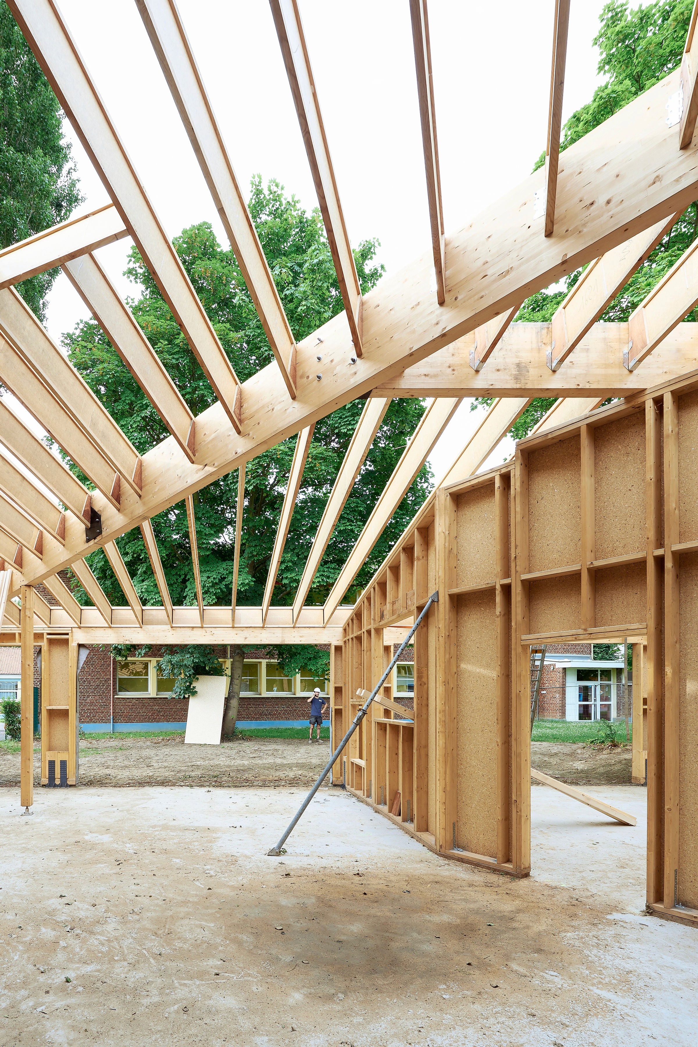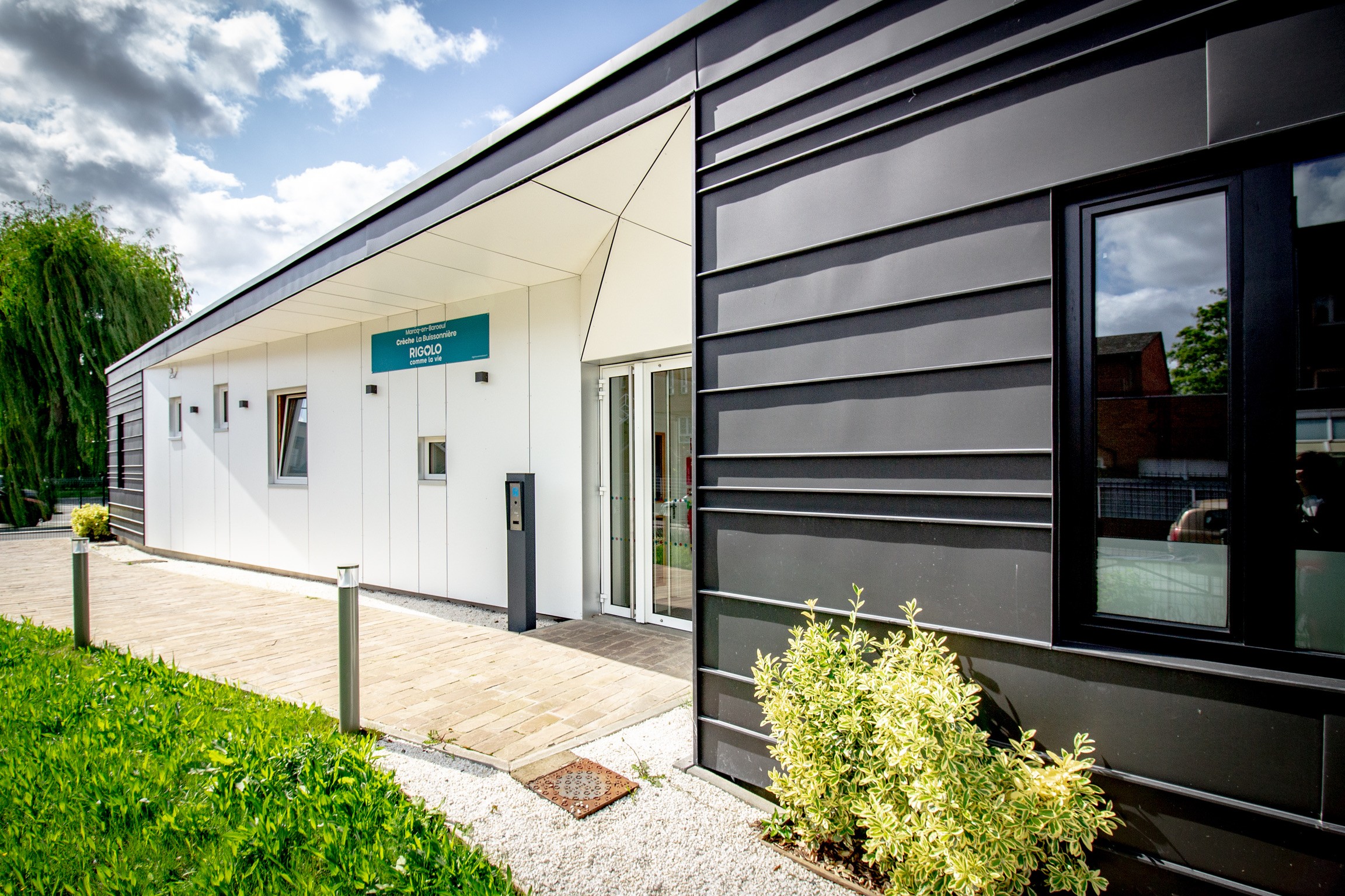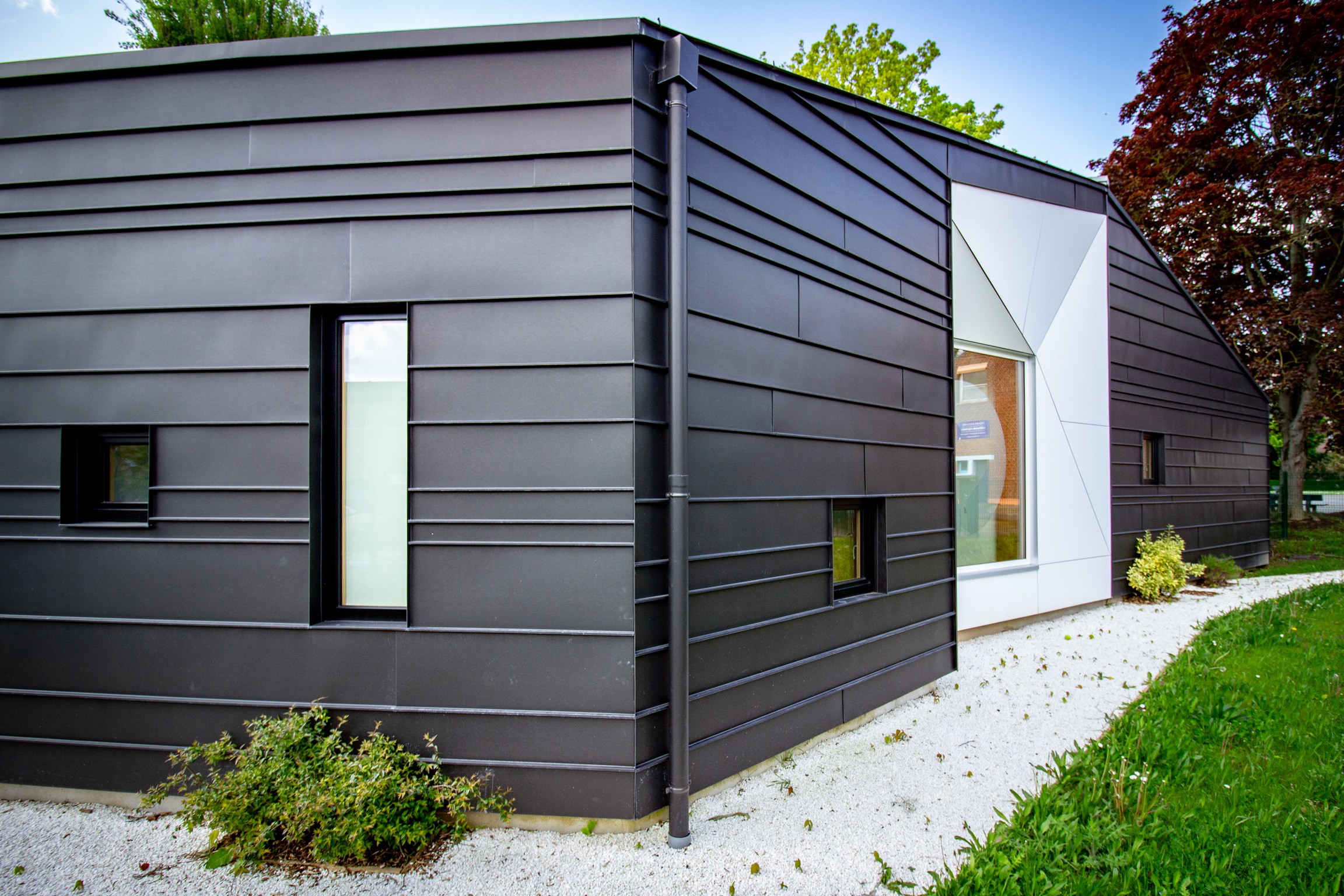 C’est dans ce contexte que s’implante le nouvel équipement d’accueil de l’enfance, à la fois manifeste comme pôle dédié et intégré au quartier. Le projet reprend l’esprit des bâtiments scolaires voisins tout en affirmant une identité propre : une coque protectrice bardée de cuivre, en écho aux teintes locales de brique et de tuile.