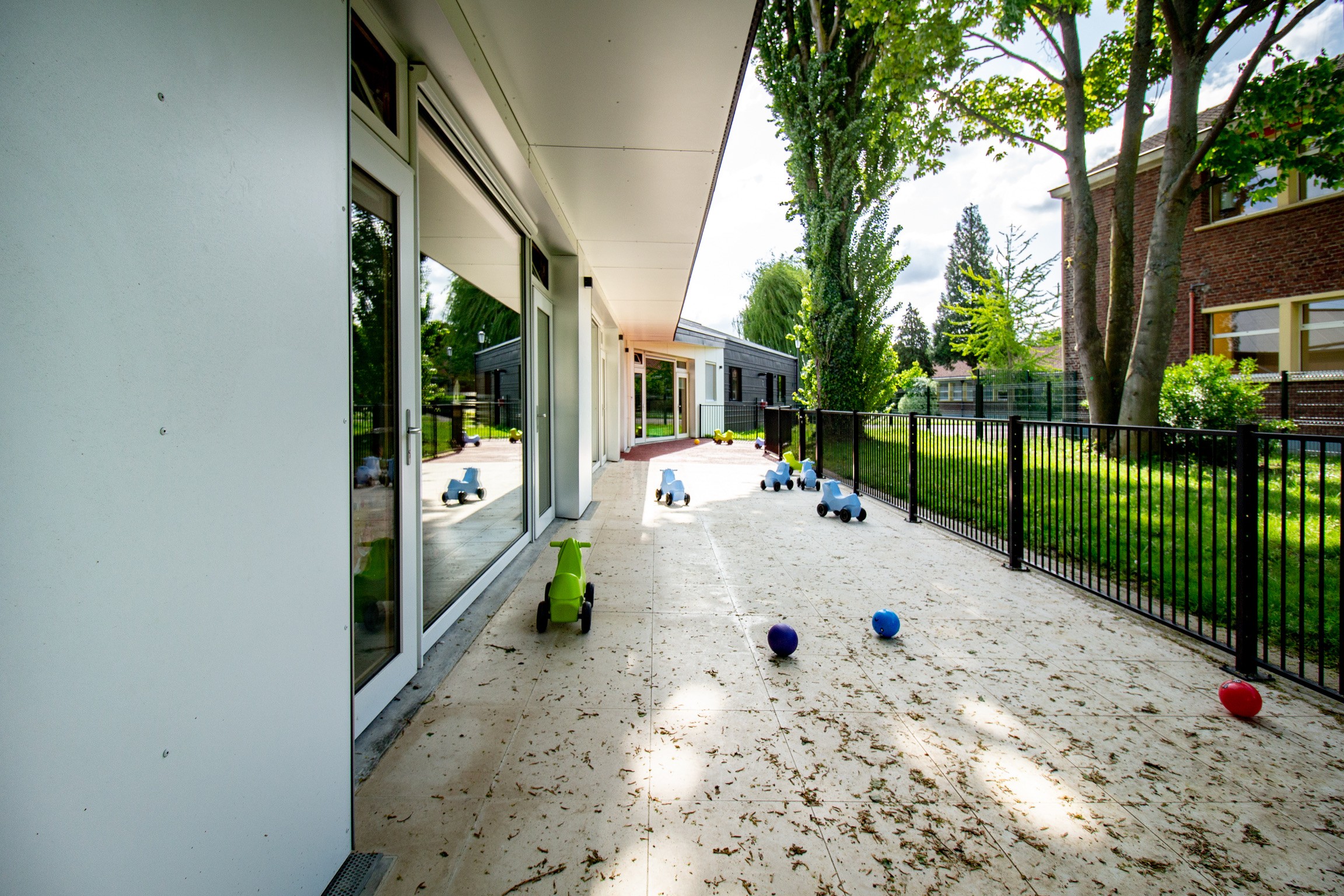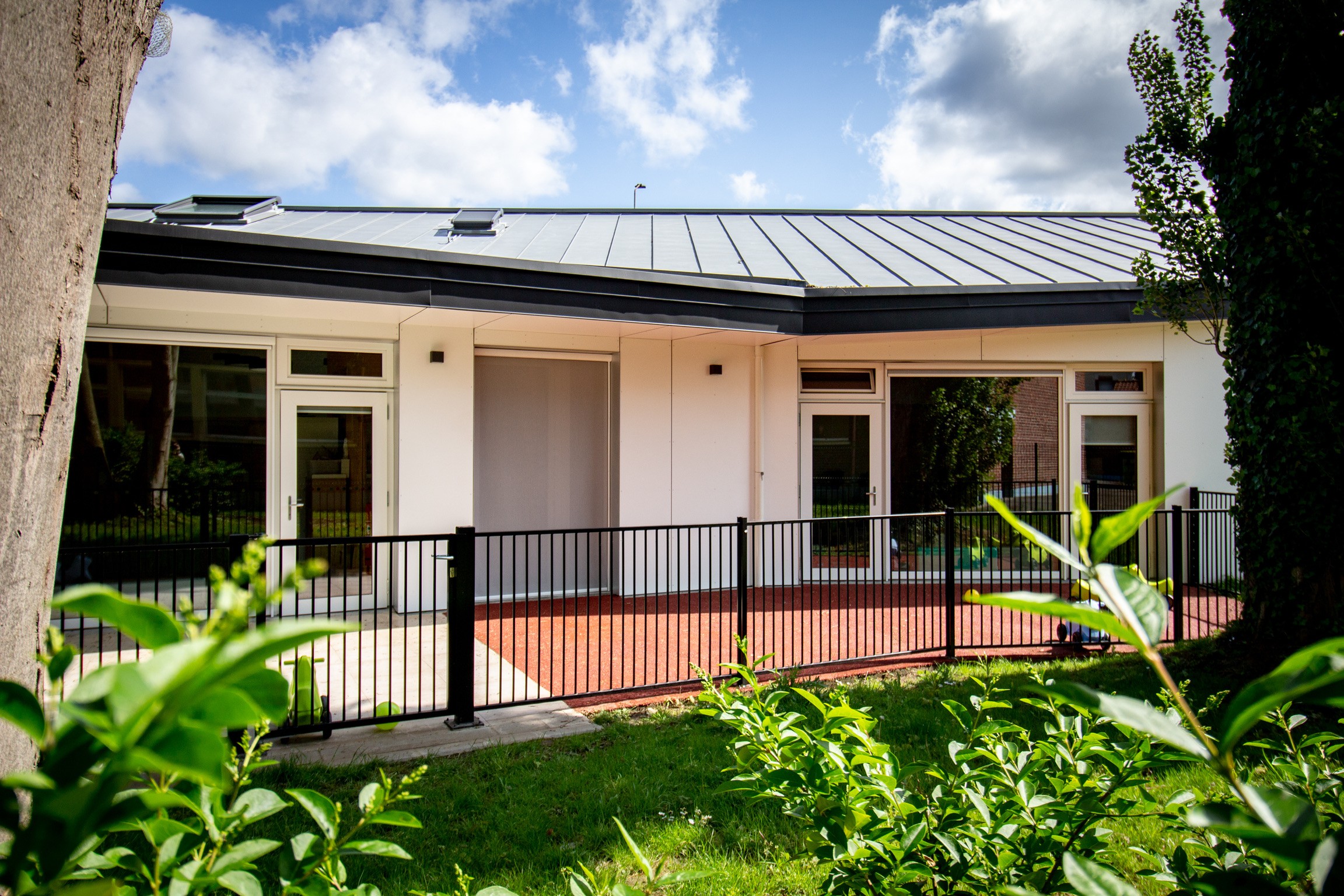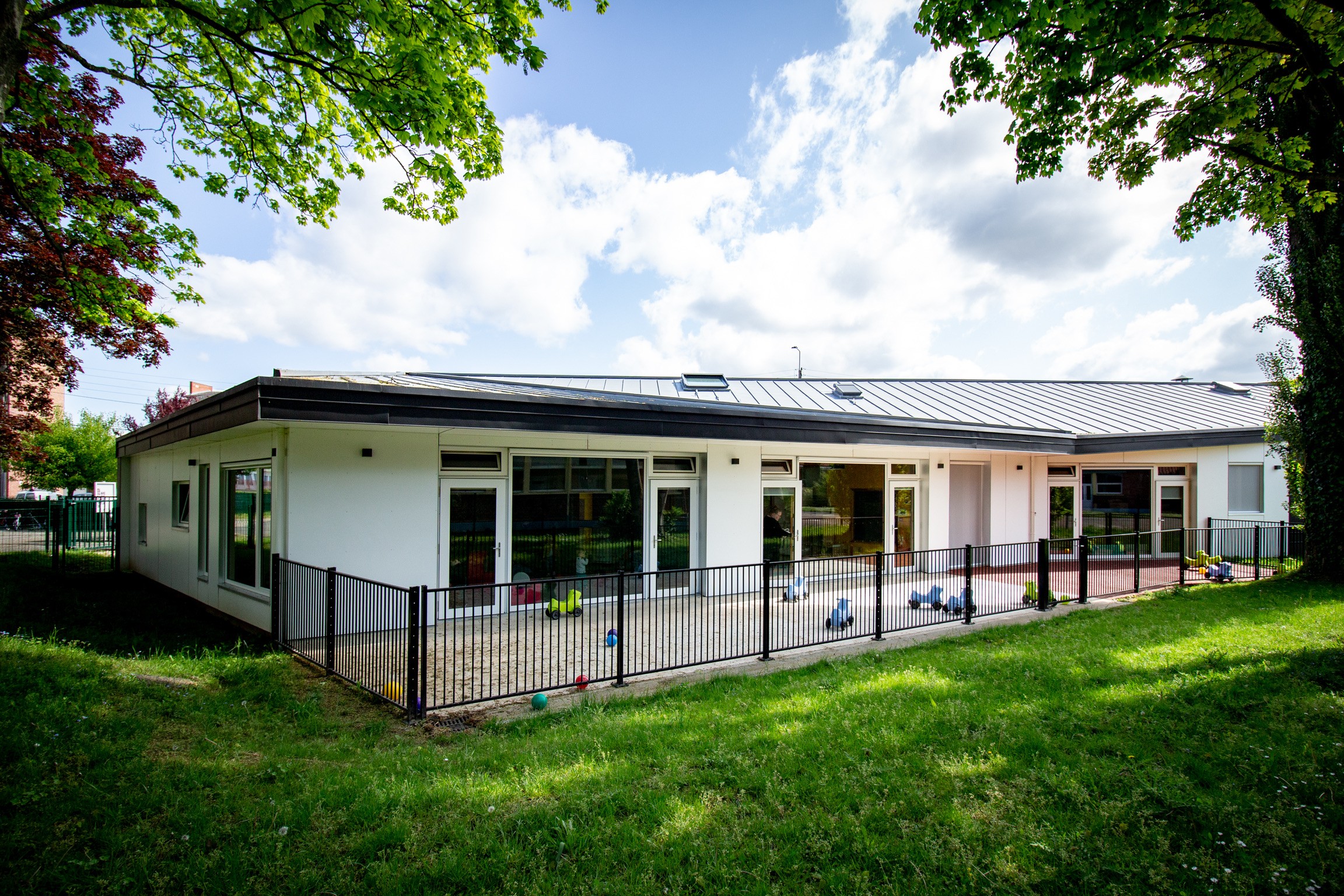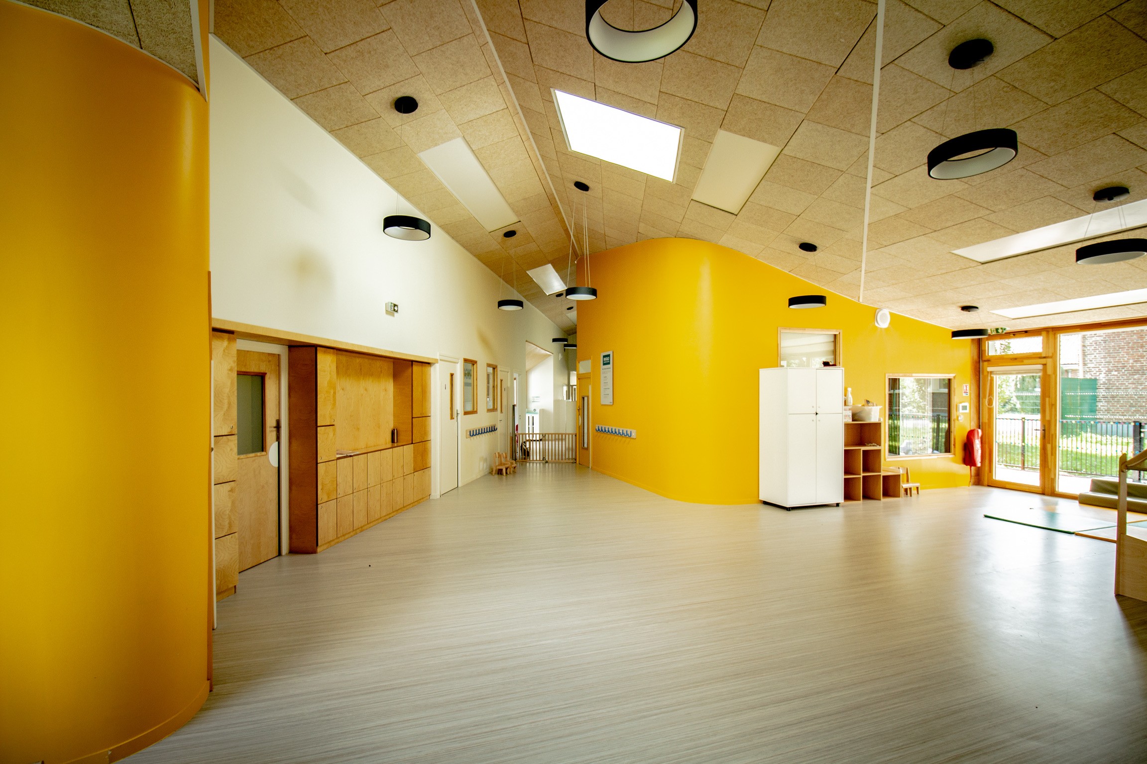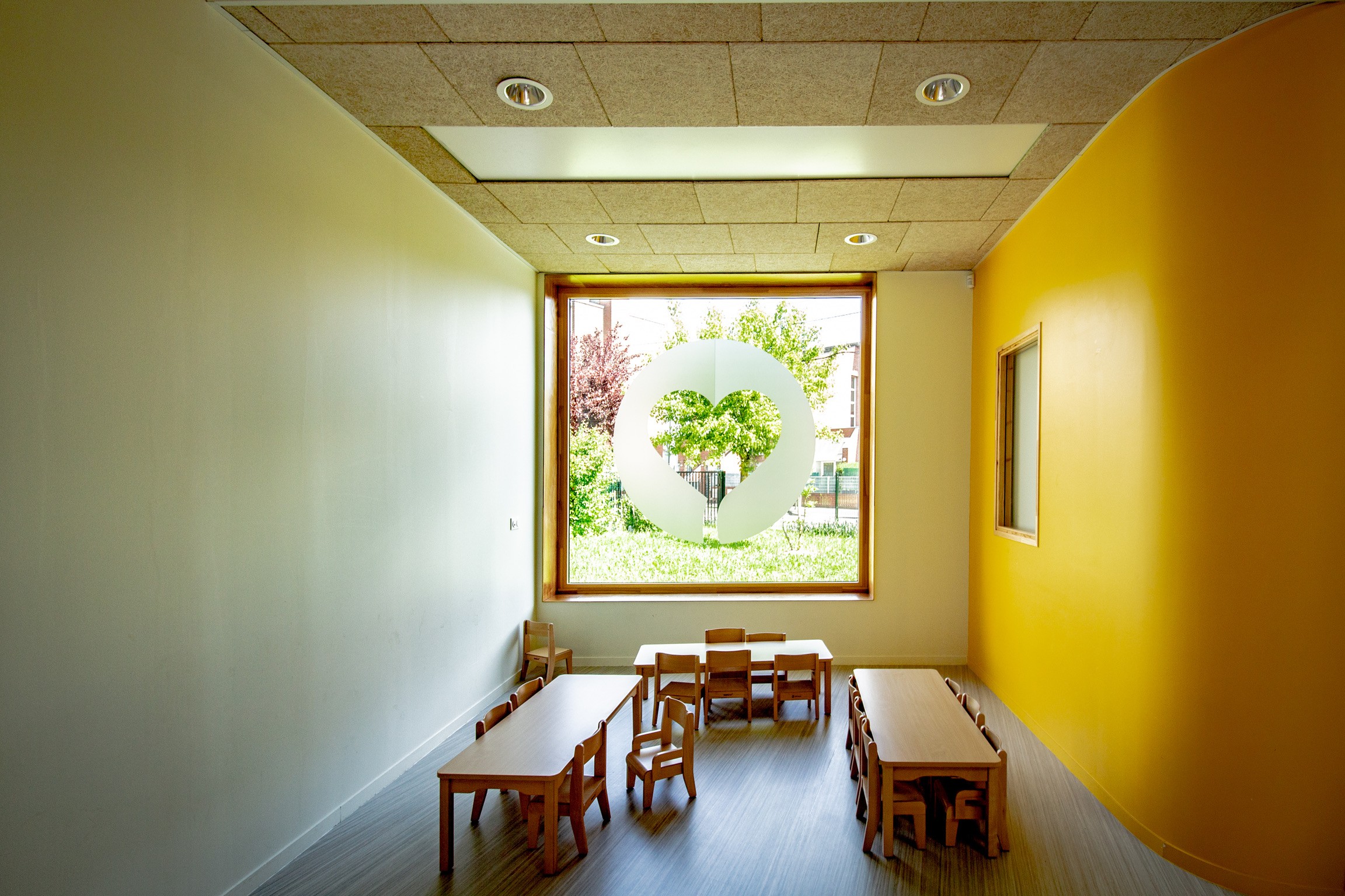 À l’intérieur, les séquences d’entrée, les circulations et les ouvertures vers le vaste jardin sont conçues dans des matériaux plus chauds, pensés à l’échelle des enfants. La composition privilégie la fluidité, la lumière naturelle et le lien avec le paysage, offrant un cadre protecteur et ouvert, adapté aux tout-petits.