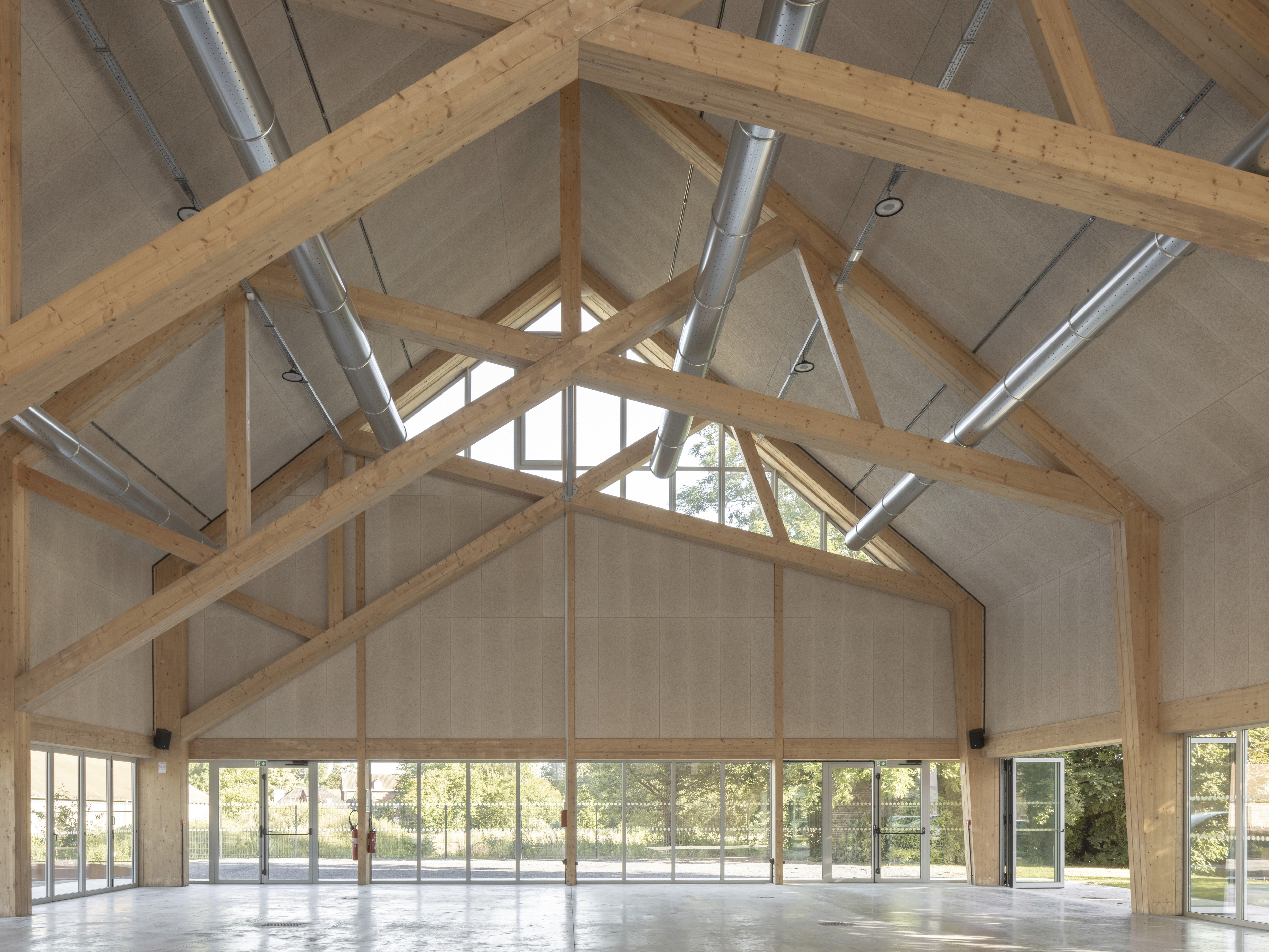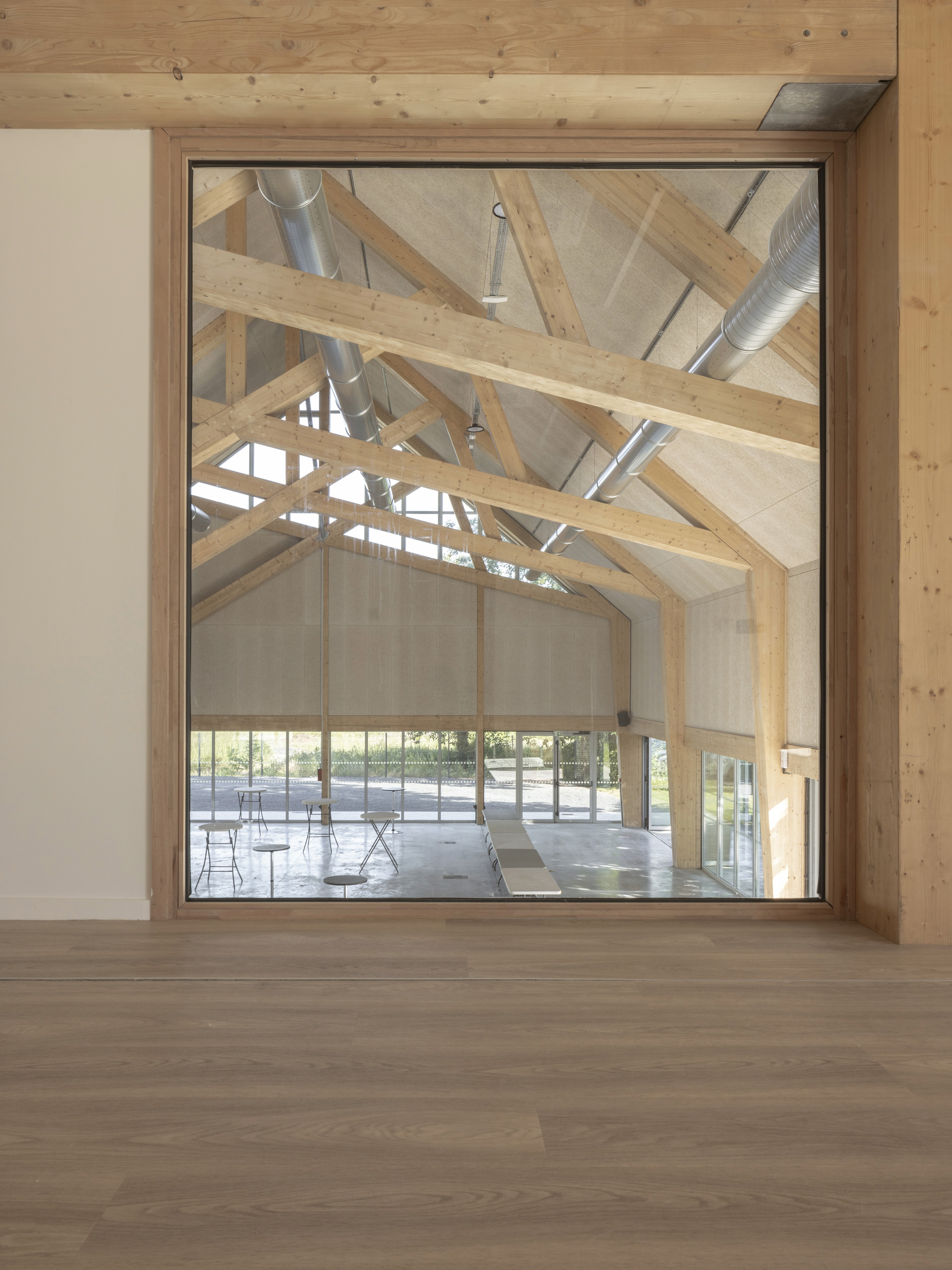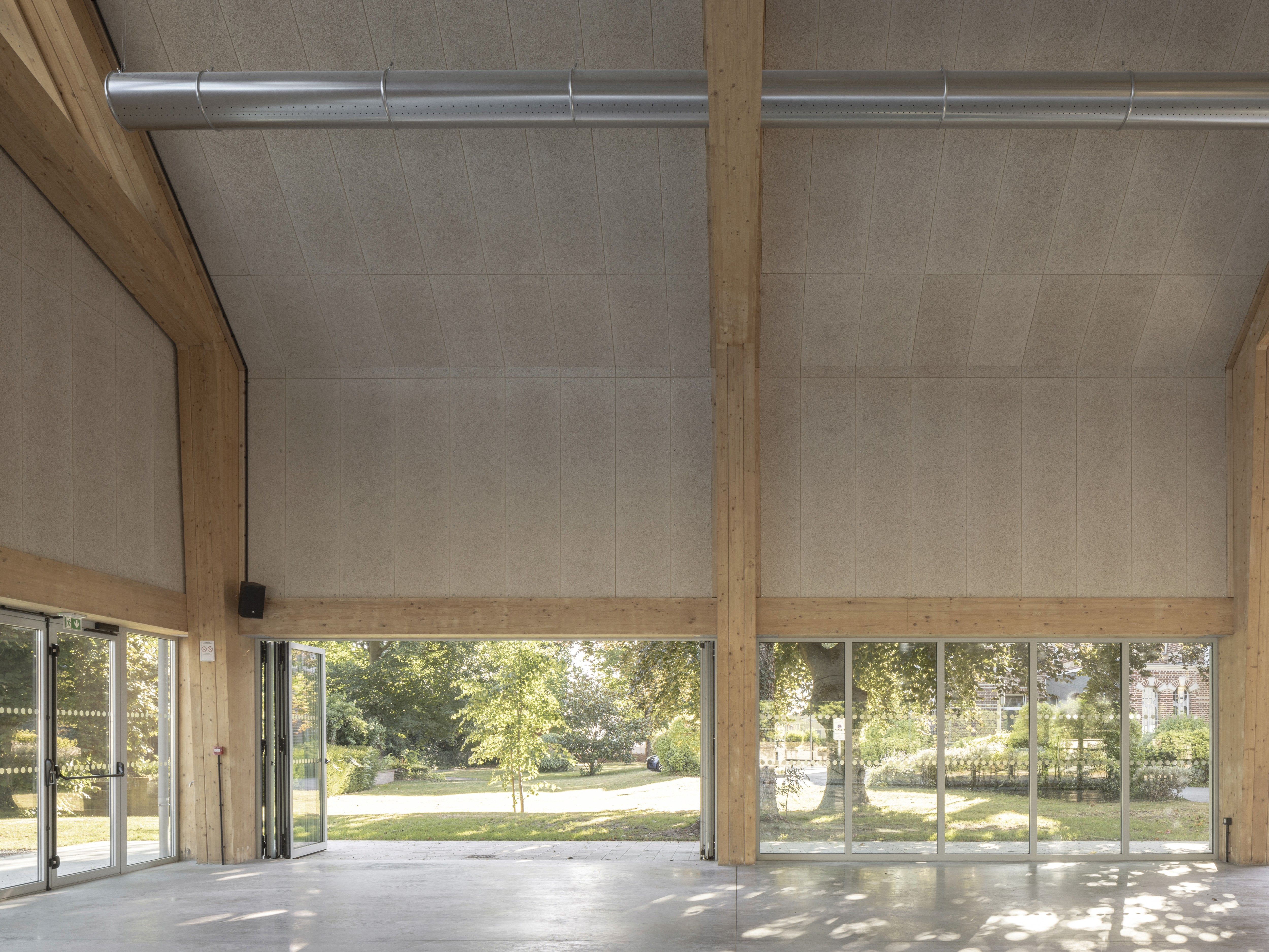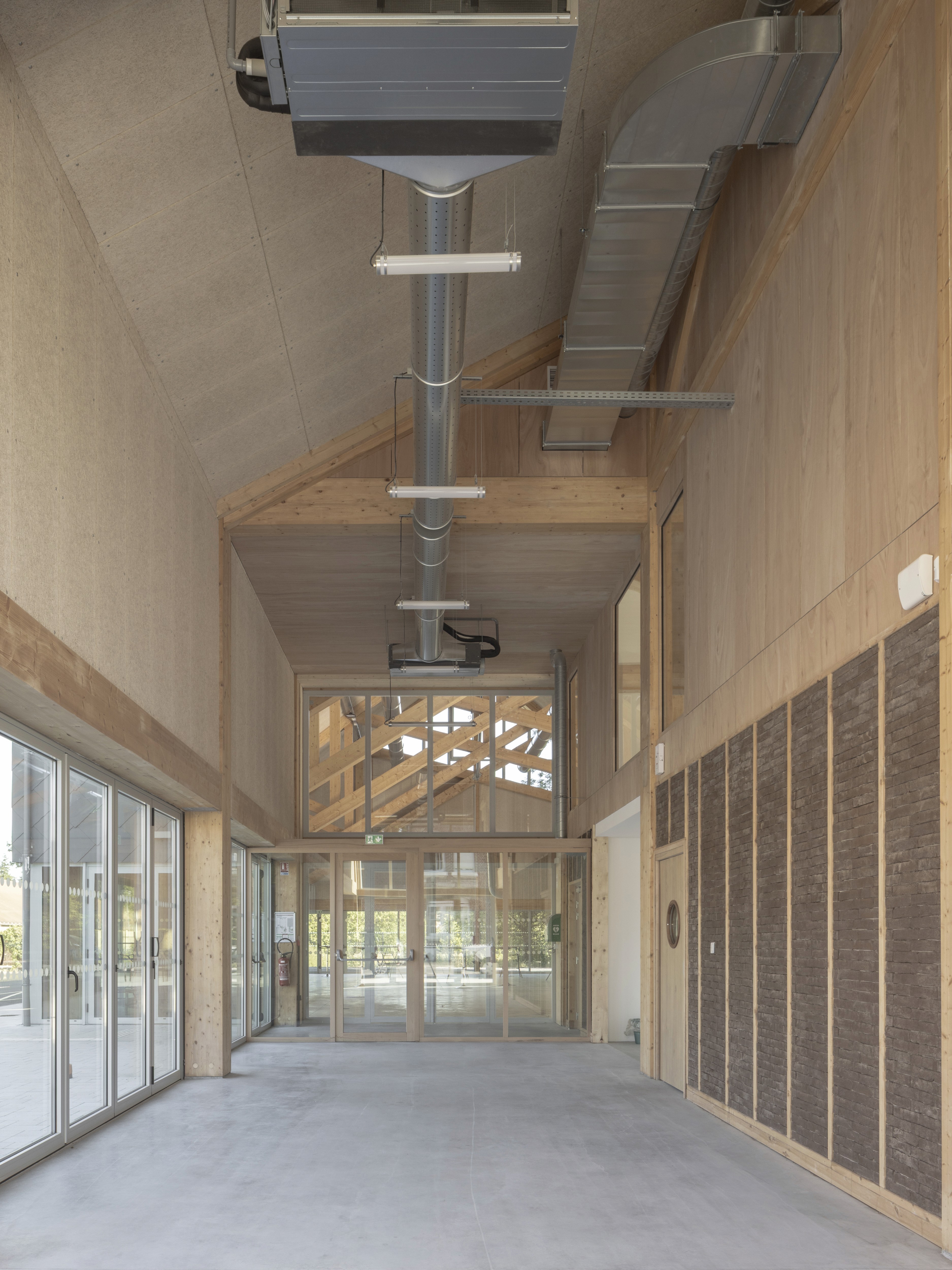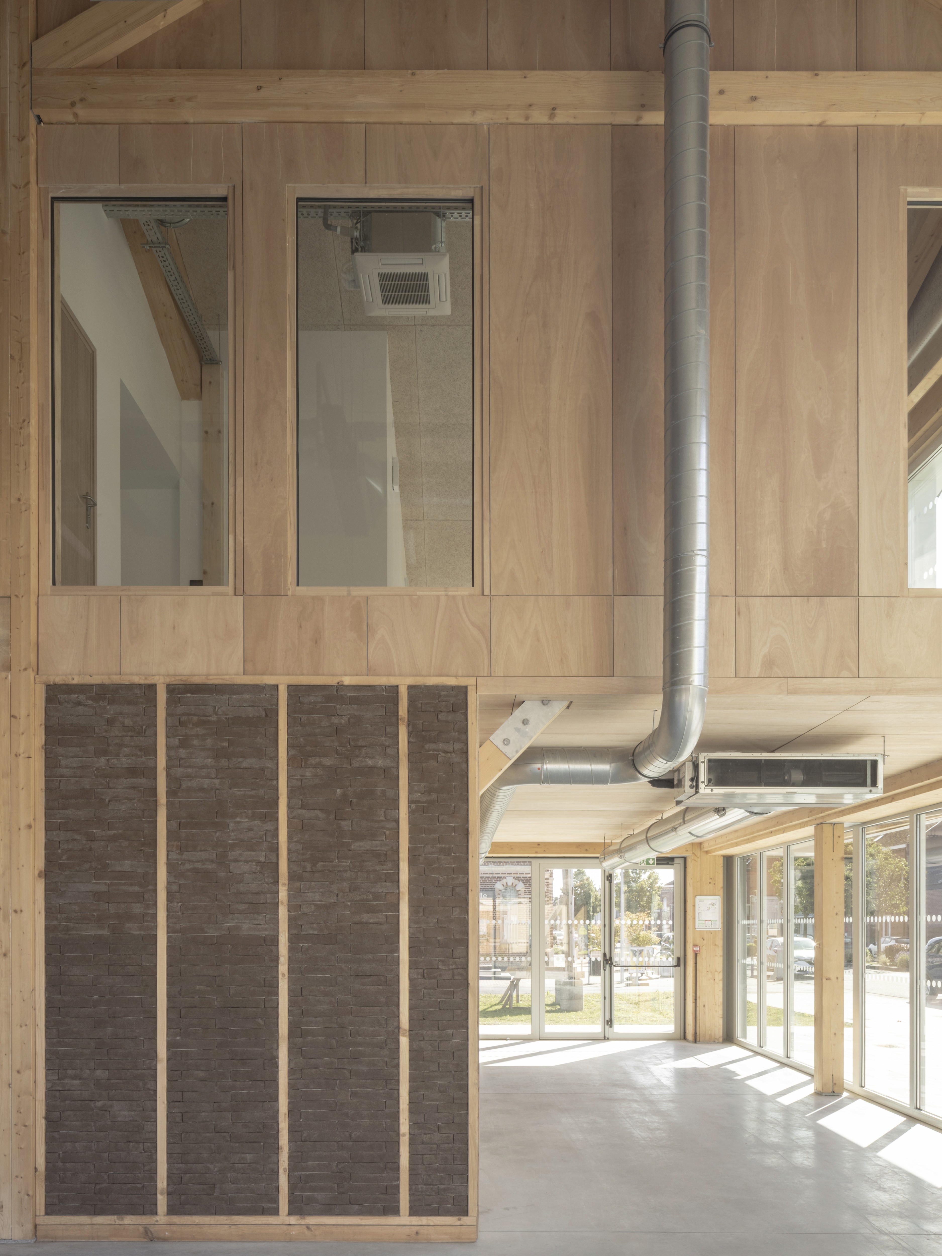 La structure principale propose un complexe Bois - paille. Toute l’isolation permet d’assurer une labellisation Biosourcée niveau 3. La peau extérieure est une écaille métallique recyclable à 99 %. Les panneaux d’habillage perforés sont issus de la filière de réemploi et proviennent de l’entreprise Ciuch. En cloisonnement intérieur entre tiers-lieu et restaurant, un mur en ossature bois avec un remplissage de brique de terre cuite confirme confort acoustique et sobriété énergétique.