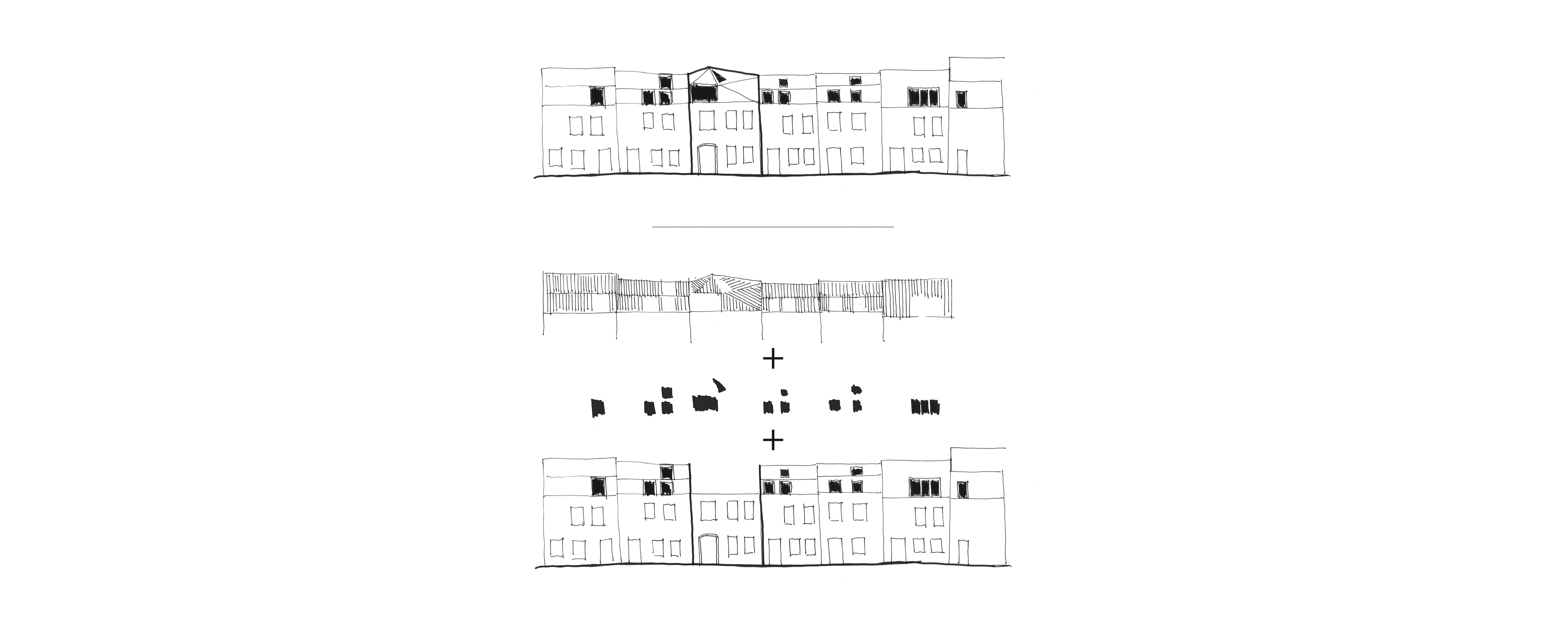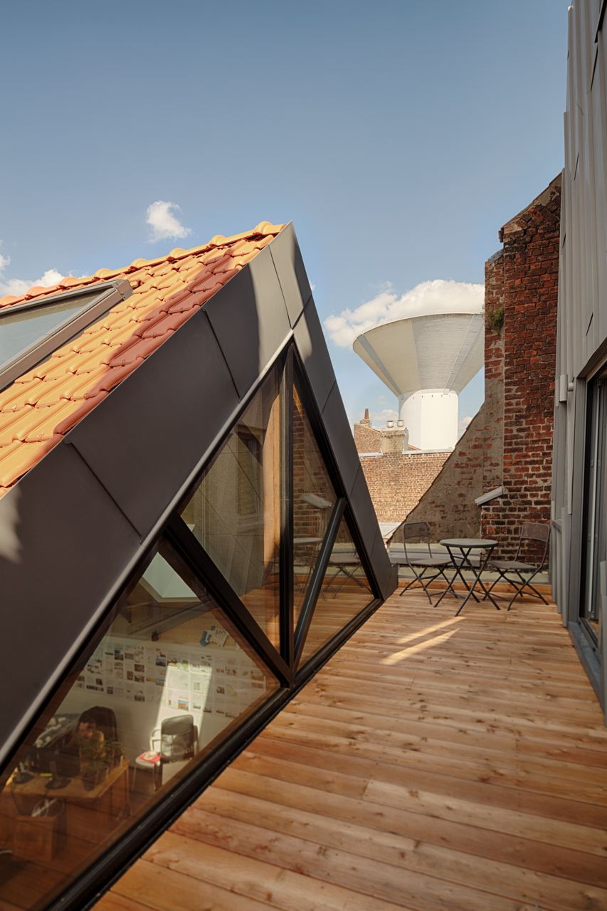 En périmètre ABF, la surélévation du R2 trouve sa justesse dans la réinterprétation des couvertures à mansardes des maisons de rang et en intégrant le rythme des chiens assis. Cette approche contemporaine et respectueuse du tissu urbain valorise un généreux volume ouvert sur la ville.