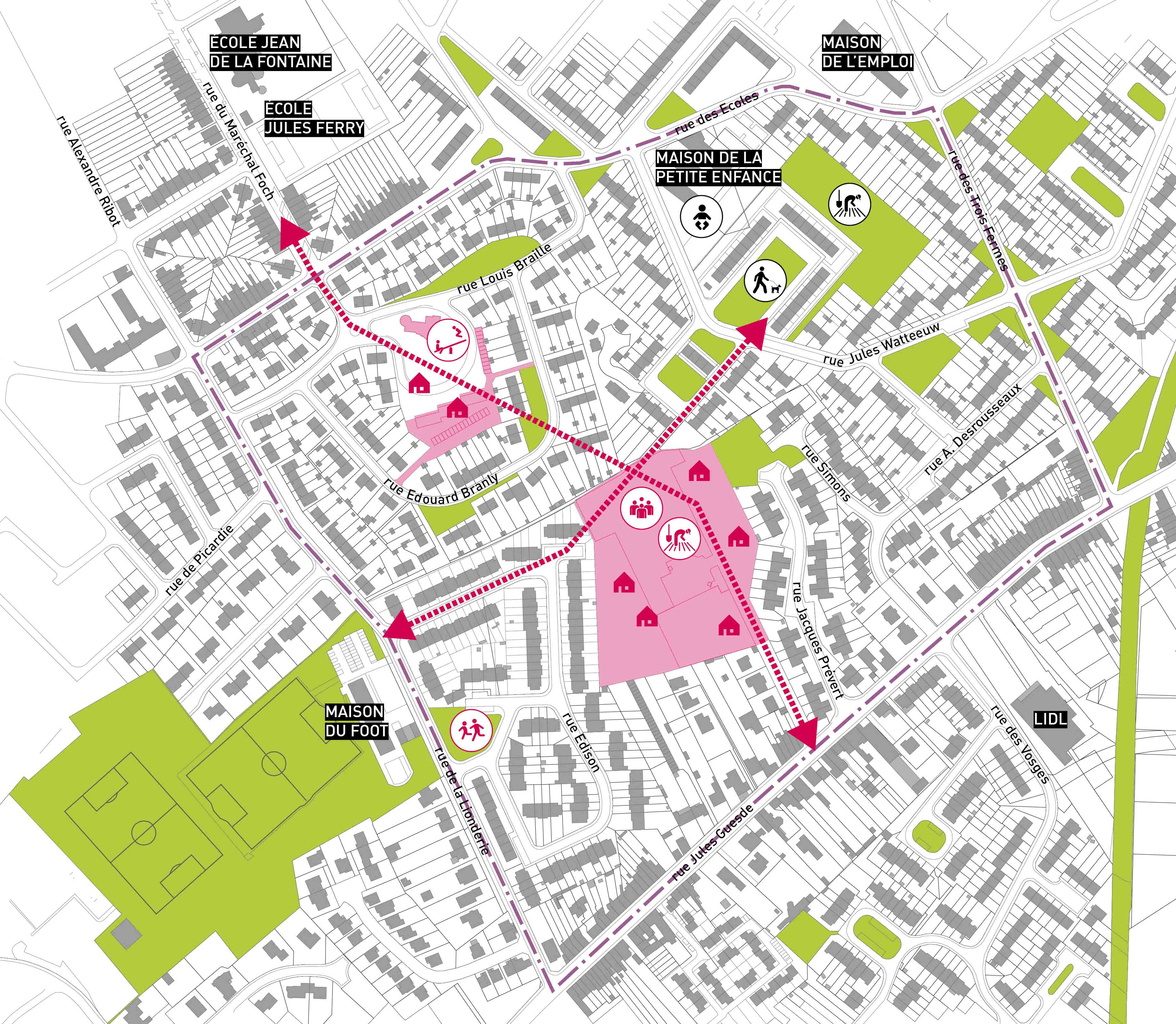 Deux postures ont guidé le travail de conception urbaine : désenclaver et valoriser le caractère jardiné du quartier. D’une part, l’aménagement d’un vaste espace public central, en écho à la linéarité du jardin des perspectives situé à quelques centaines de mètres, ainsi que la création de deux axes structurants manifestent le renouvellement du quartier.