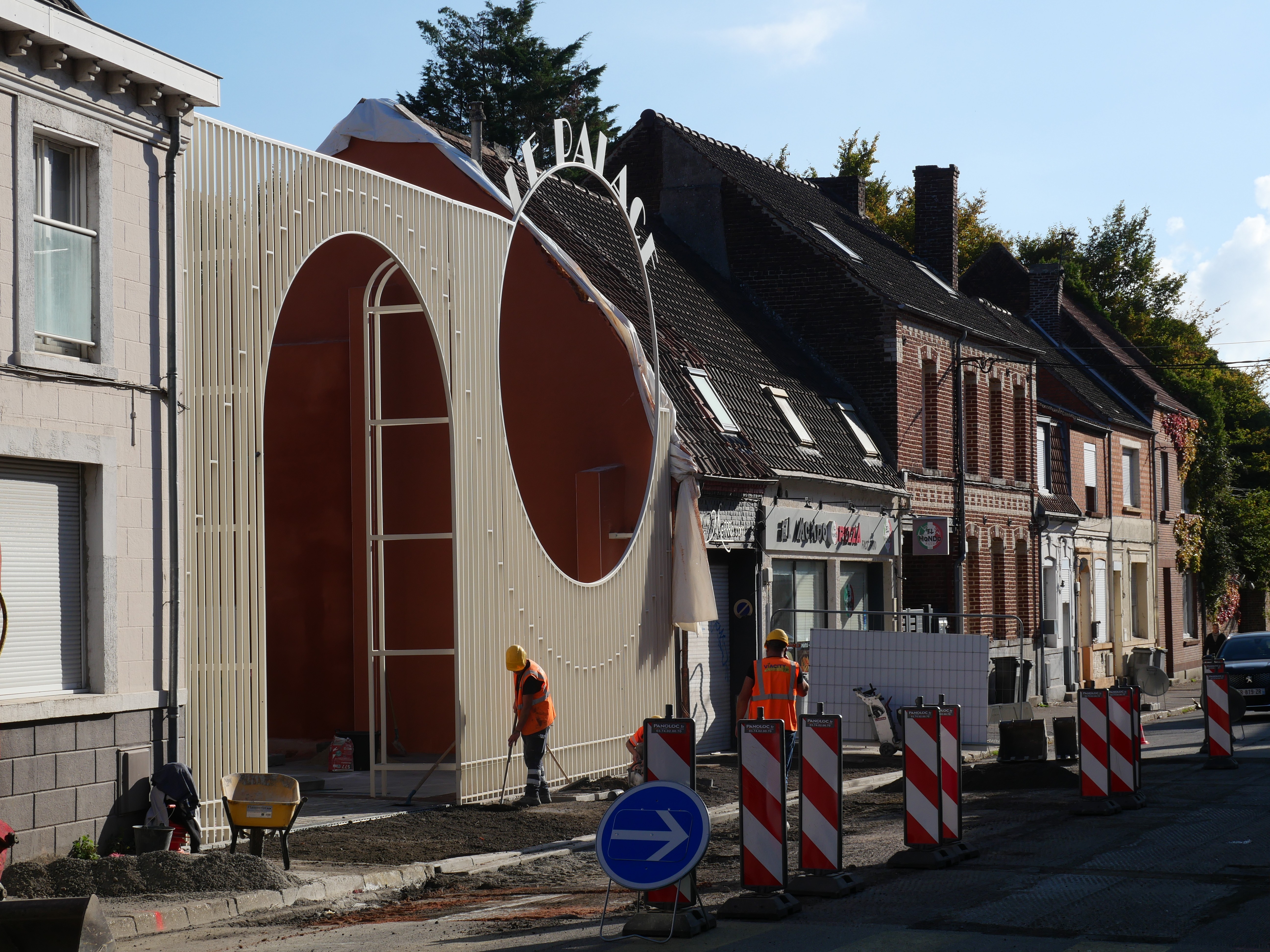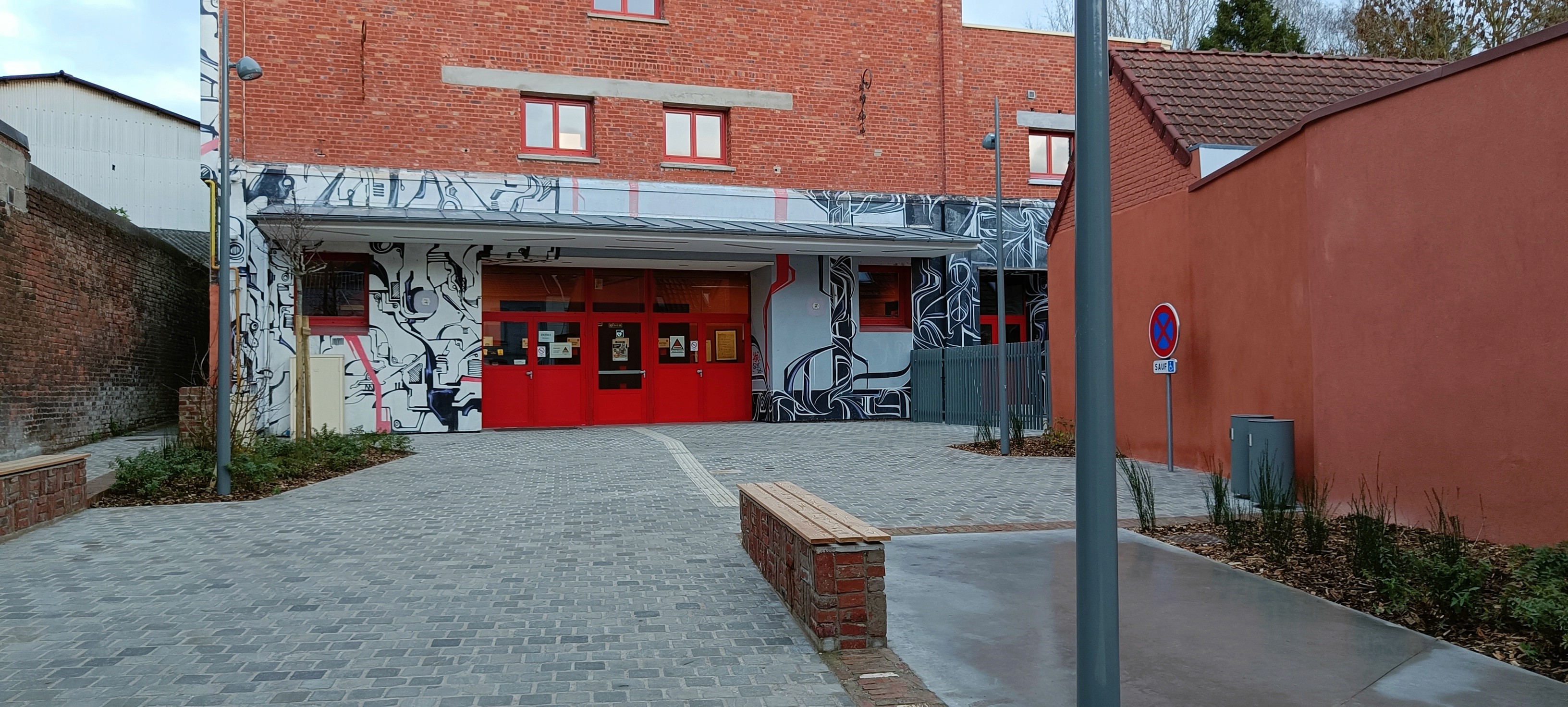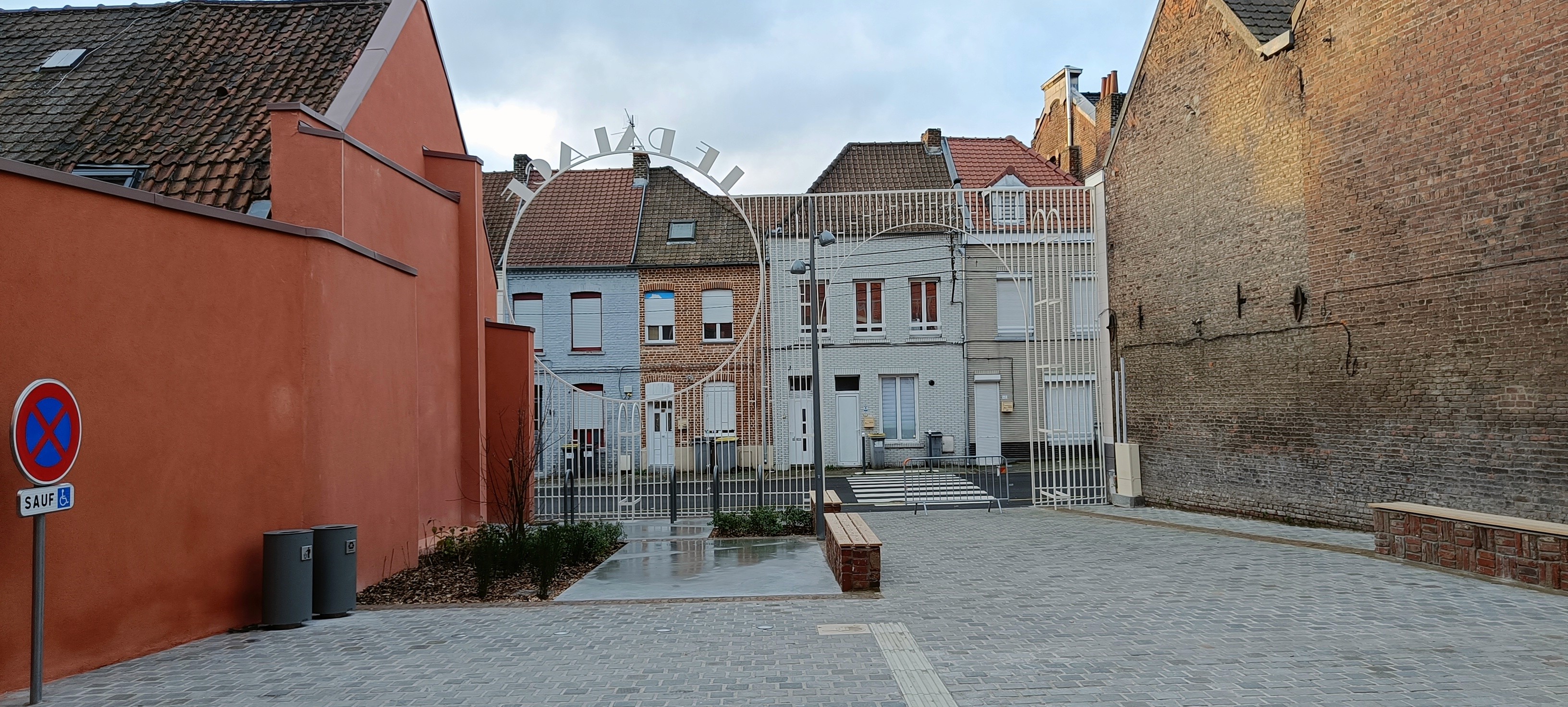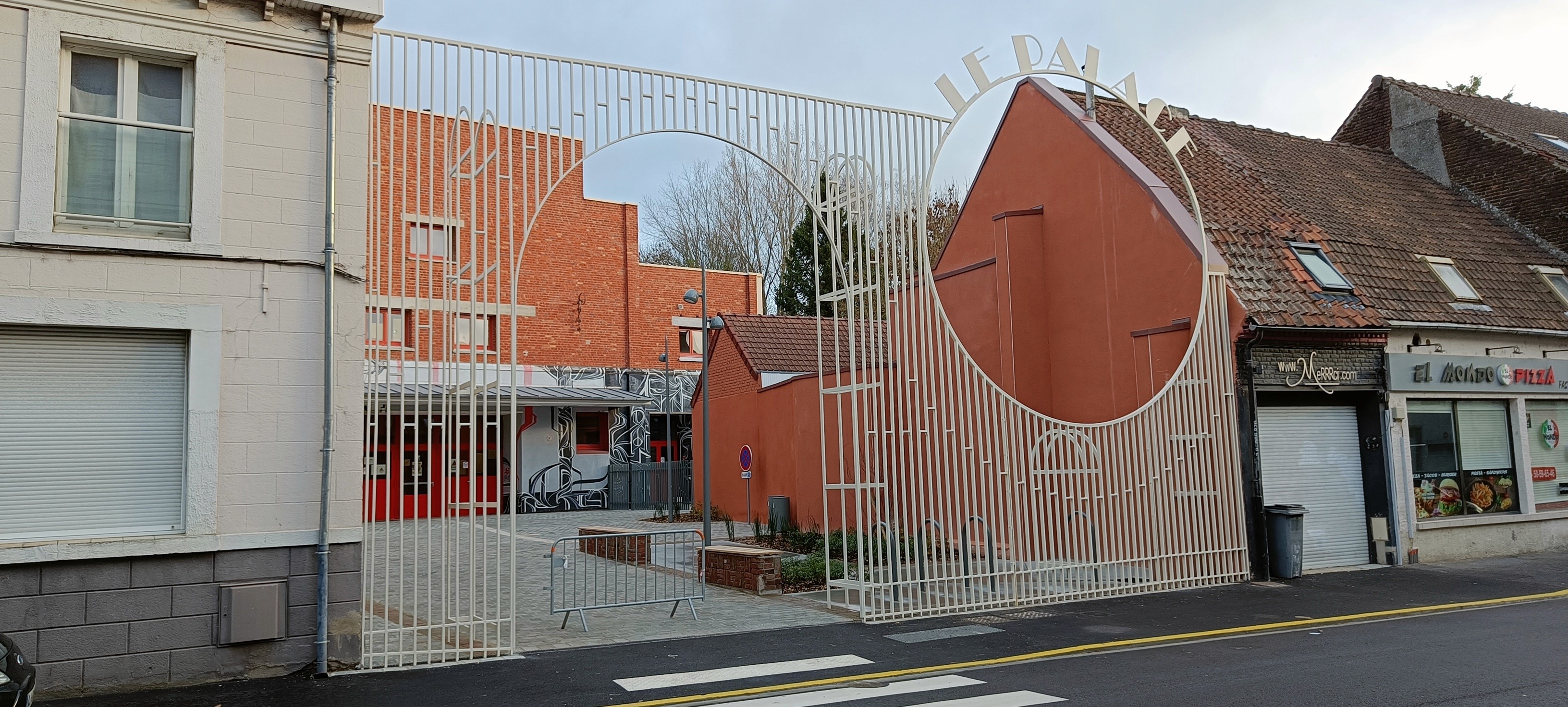 Situé au 39 rue d’Aire, le projet vise à la requalification et au réaménagement du parvis de la salle, Le Palace, équipement communal dédié aux événements et spectacles. La salle était invisible depuis la rue, car accessible uniquement en passant sous le bâtiment des Services Culturels.