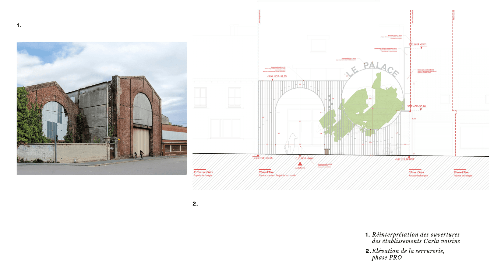 L’ouvrage élégant convoque les imposants pignons à ouvertures en plein cintre des établissements Carlu voisins.