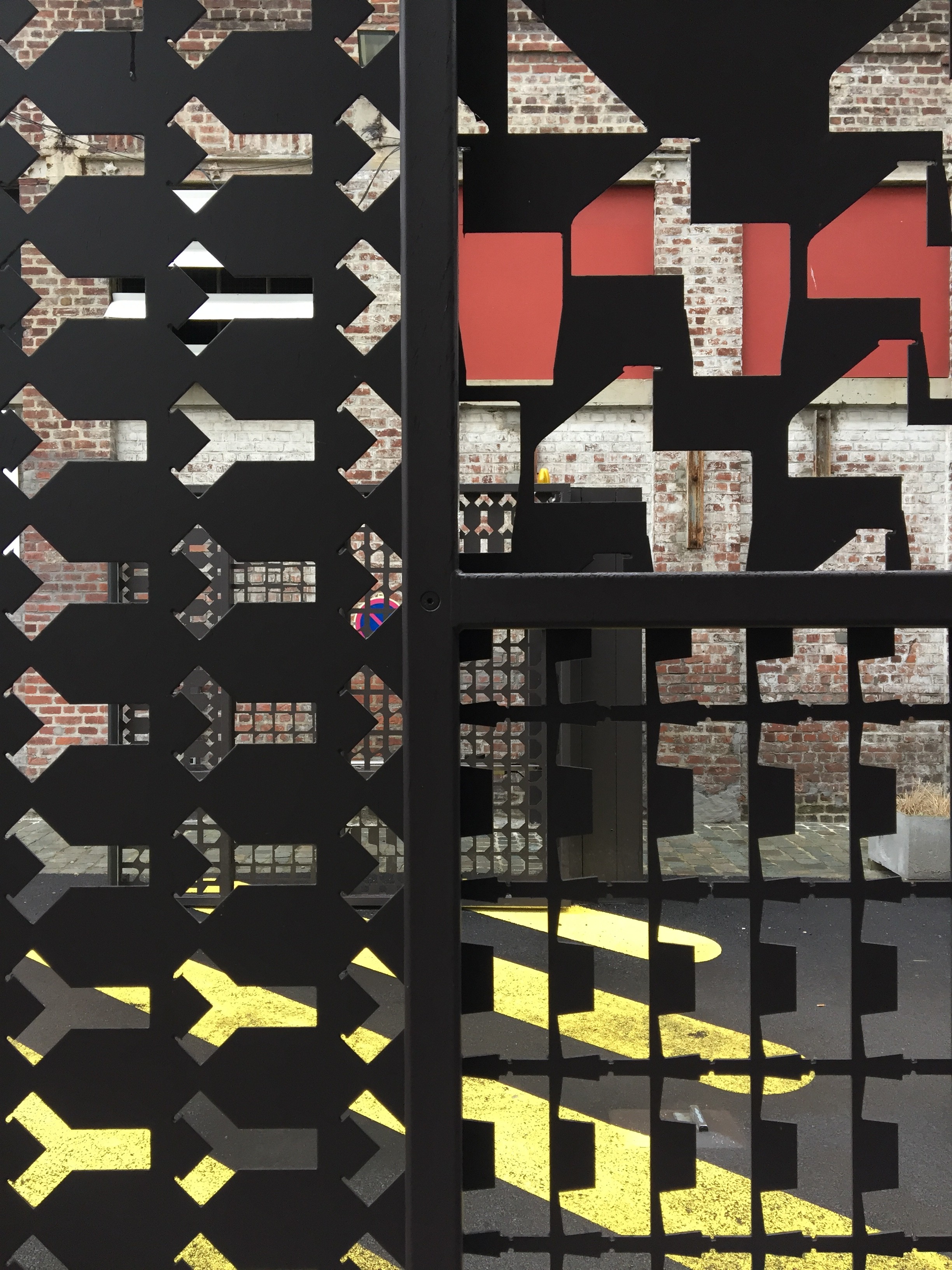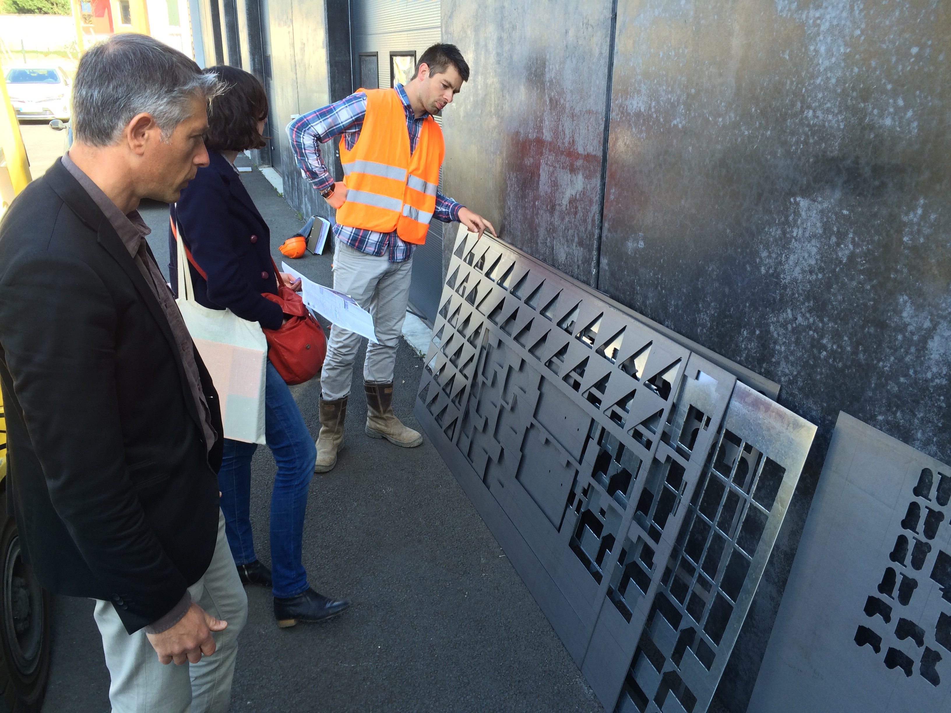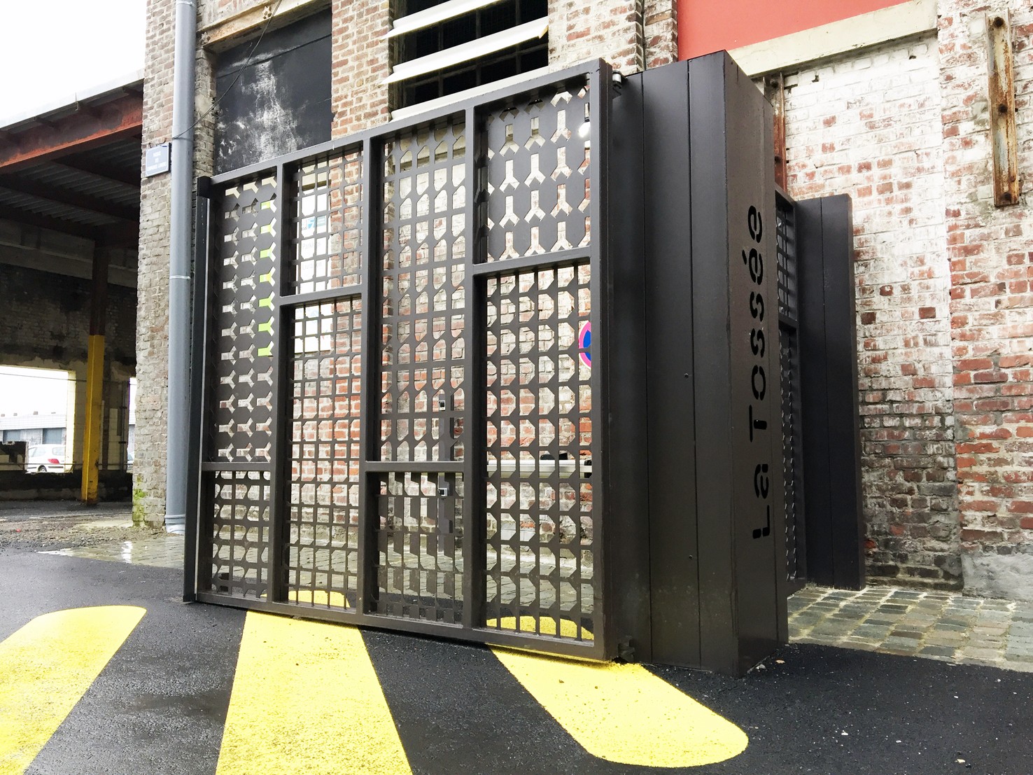 Valeur ajoutée au processus de mutation et de transformation, l’ensemble des serrureries (clôture, portail) a été réalisé avec des tôles de récupération. L’entreprise Ciuch, présente sur le site, a permis de récupérer les matrices des pièces défoncées que nous avons sélectionnées, assemblées et laquées.
