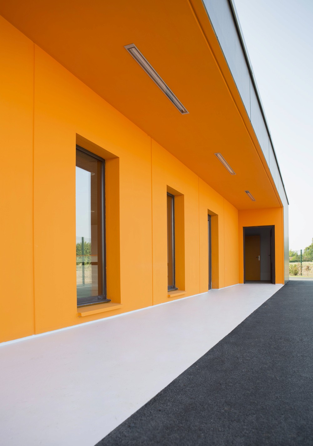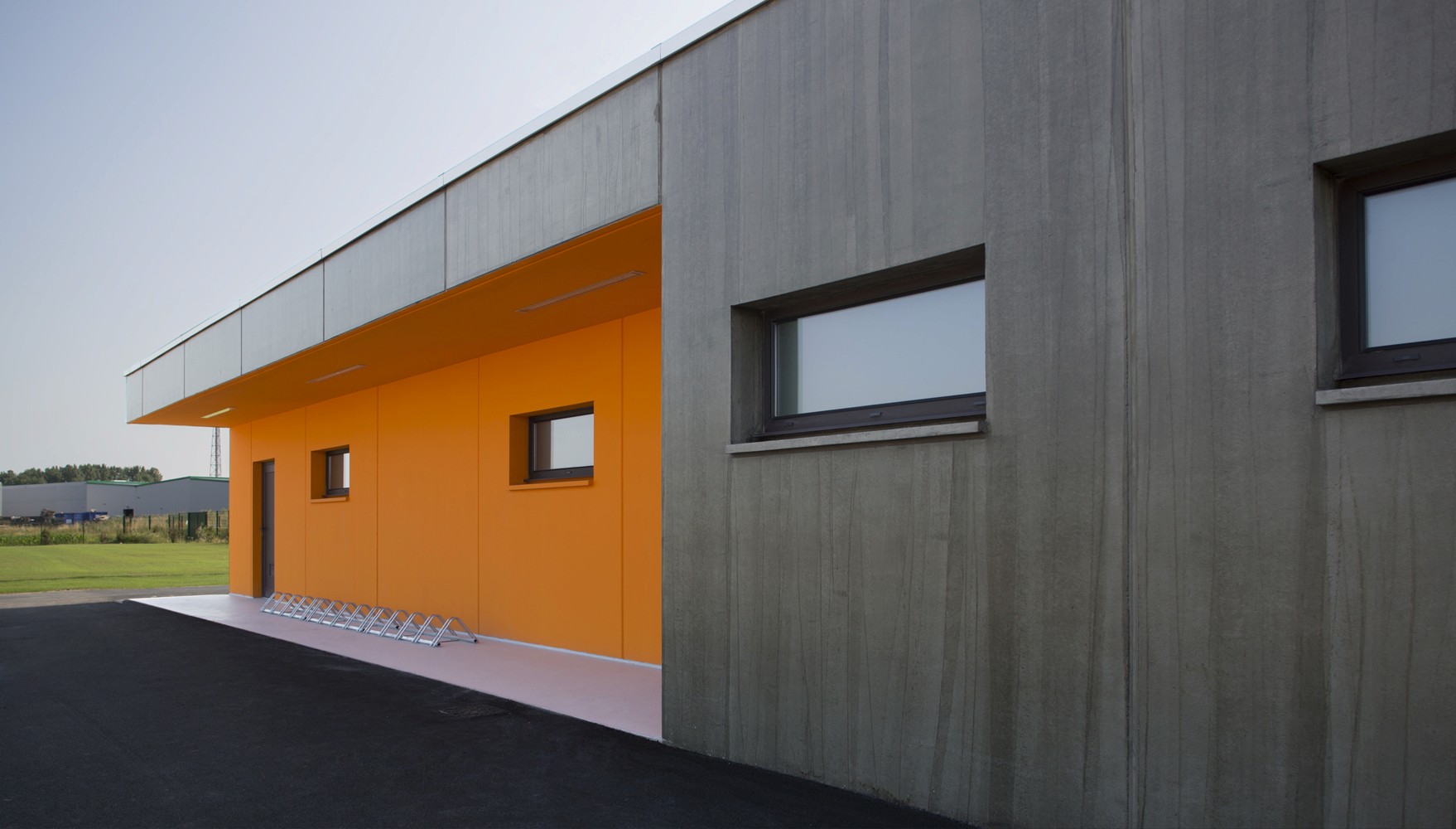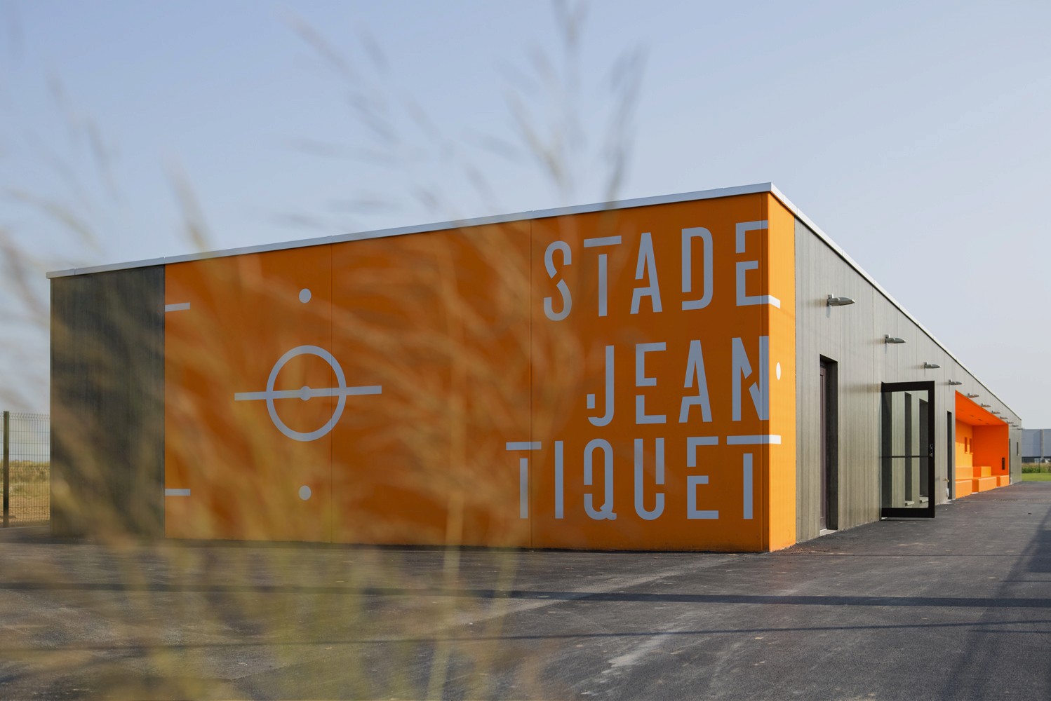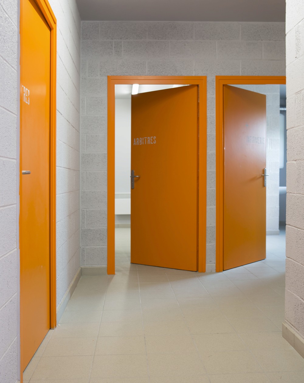 Le volume de béton lasuré est creusé ponctuellement pour gérer les espaces techniques, tribune abritée, sas d’entrée. Les trames structurelles et de percements se calent avec soin sur le jeu des panneaux béton.