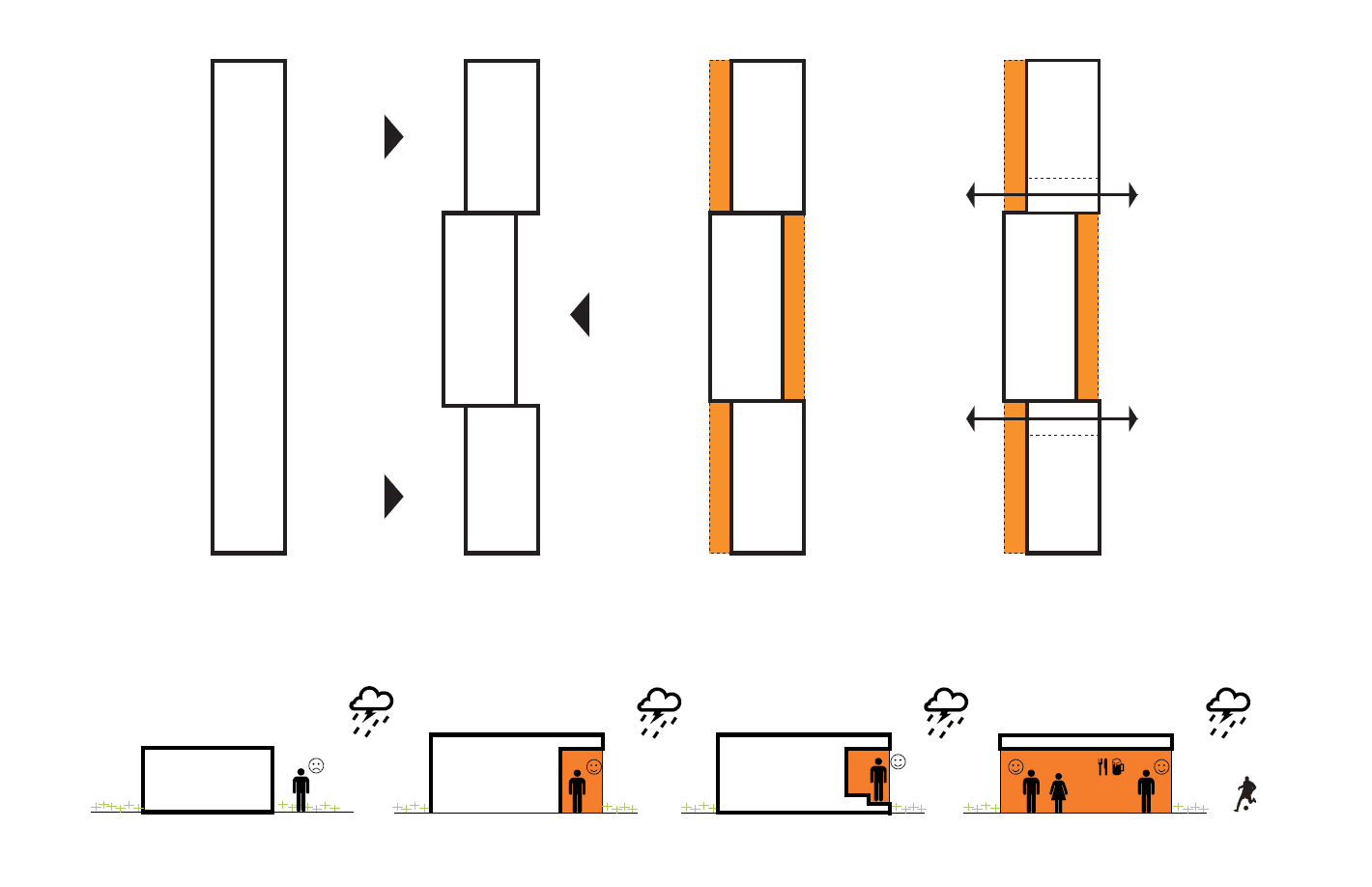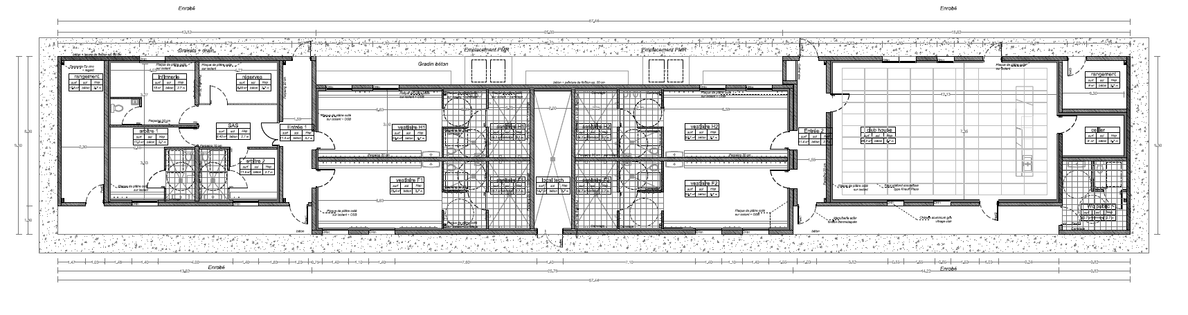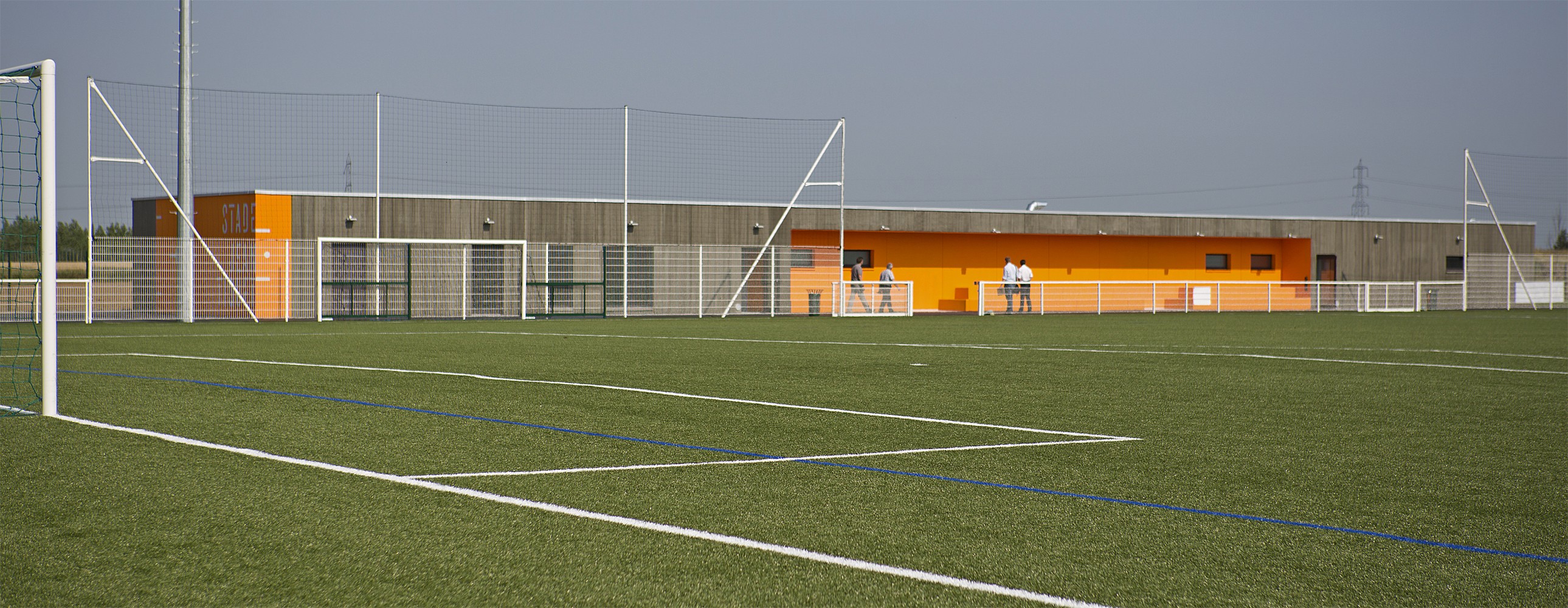 Le projet est un volume simple qui se dépose au centre du plateau sportif. Il articule les deux terrains de football de part et d’autre.